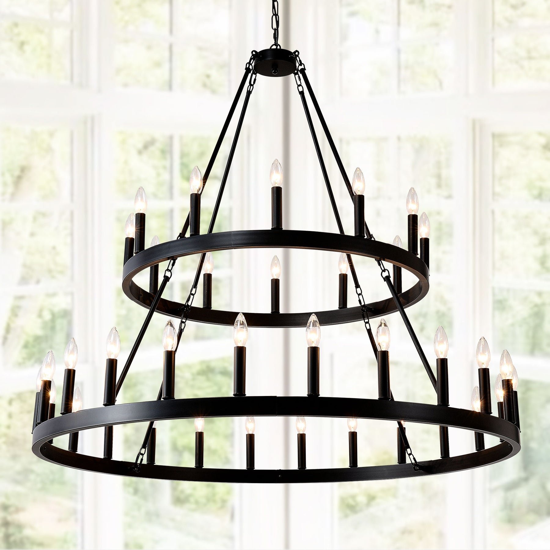 2 Tiers Wagon Wheel Chandelier Wooden Farmhouse 36 Light (24 / 12) Or (12 / 24) Metal Chandeliers 2 Story Light Fixtures Industrial For High Ceiling Living Dining Room Foyer, Adjustable Height - Black