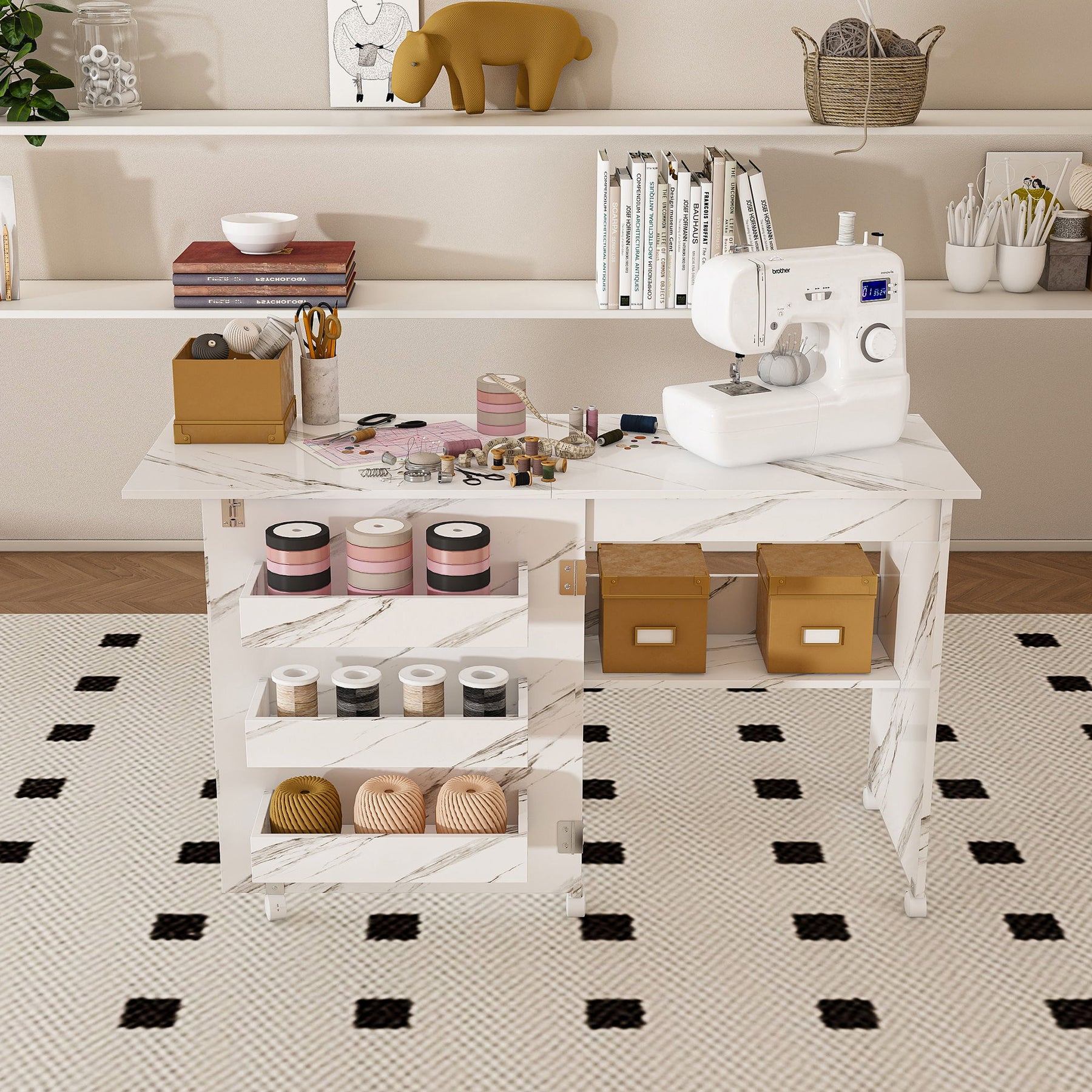 4 In 1 Folding Sewing Table With Lockable Wheels, Multi Functional Craft Station - White