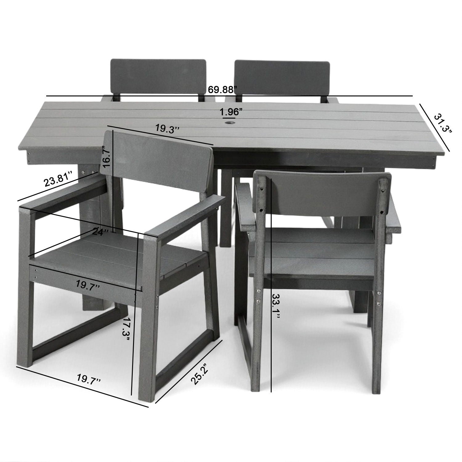 - Premium HDPE MaterialMade of high-density polyethylene, this 5-piece dining set is waterproof, UV-resistant, and fade-proof, built to last through all weather conditions.