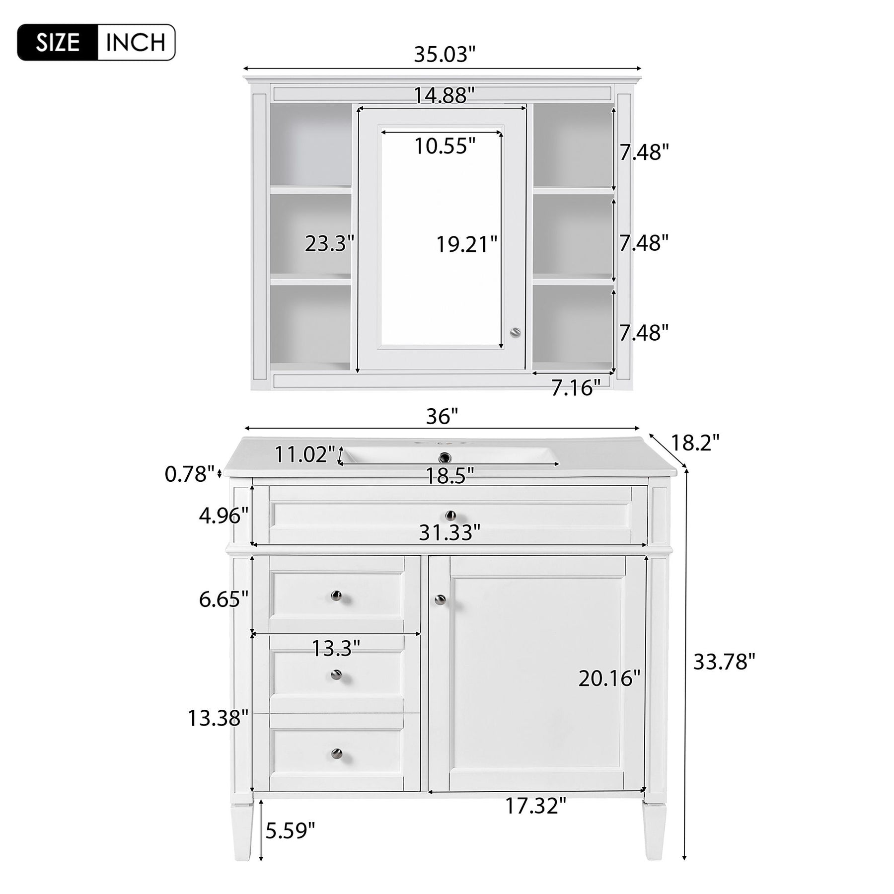 36" Bathroom Vanity With Mirror Cabinet, Sink, 2 Soft Closing Doors & 4 Drawers - White