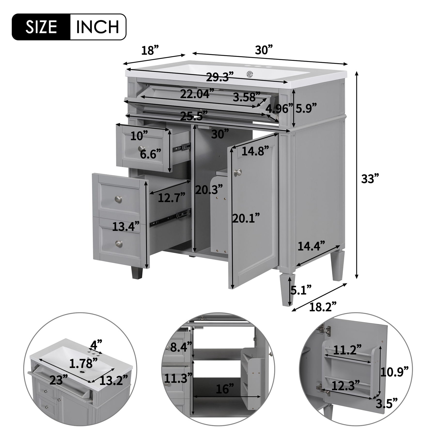 Bathroom Vanity With Top Sink, 2 Drawers And Tip-Out Drawer, Cabinet Storage Unit - Gray