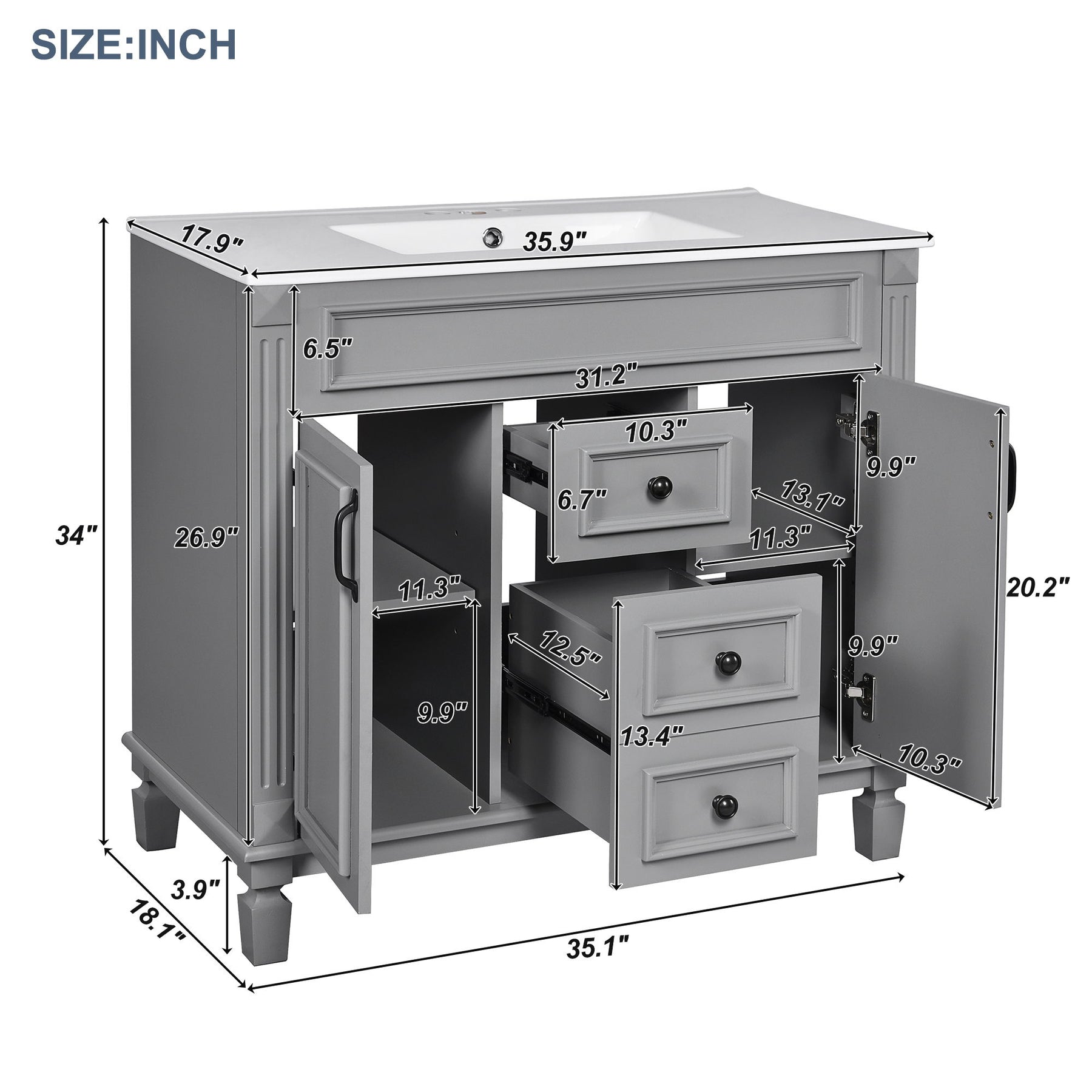 - Spacious Interior: Generous drawer and cabinet space keeps bathroom essentials organized and out of reach of water