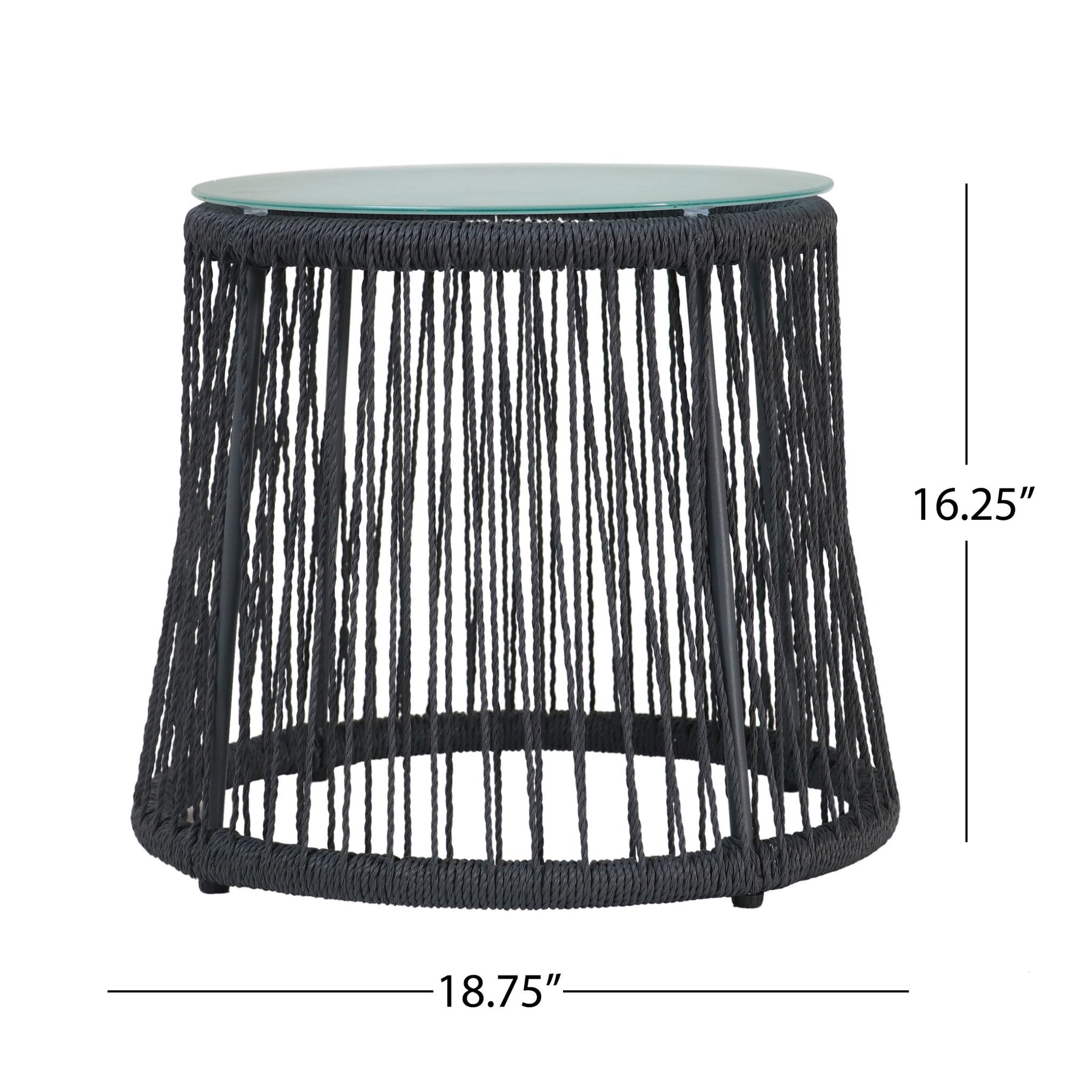 Southport - Boho Side Table With Glass Top, Woven Rope And Iron Frame - Gray