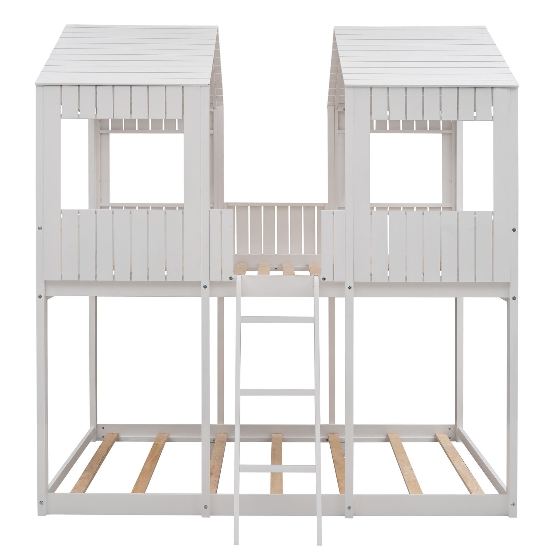 Full Over Full Bunk Bed With Roof, Window, Guardrail, Ladder - White