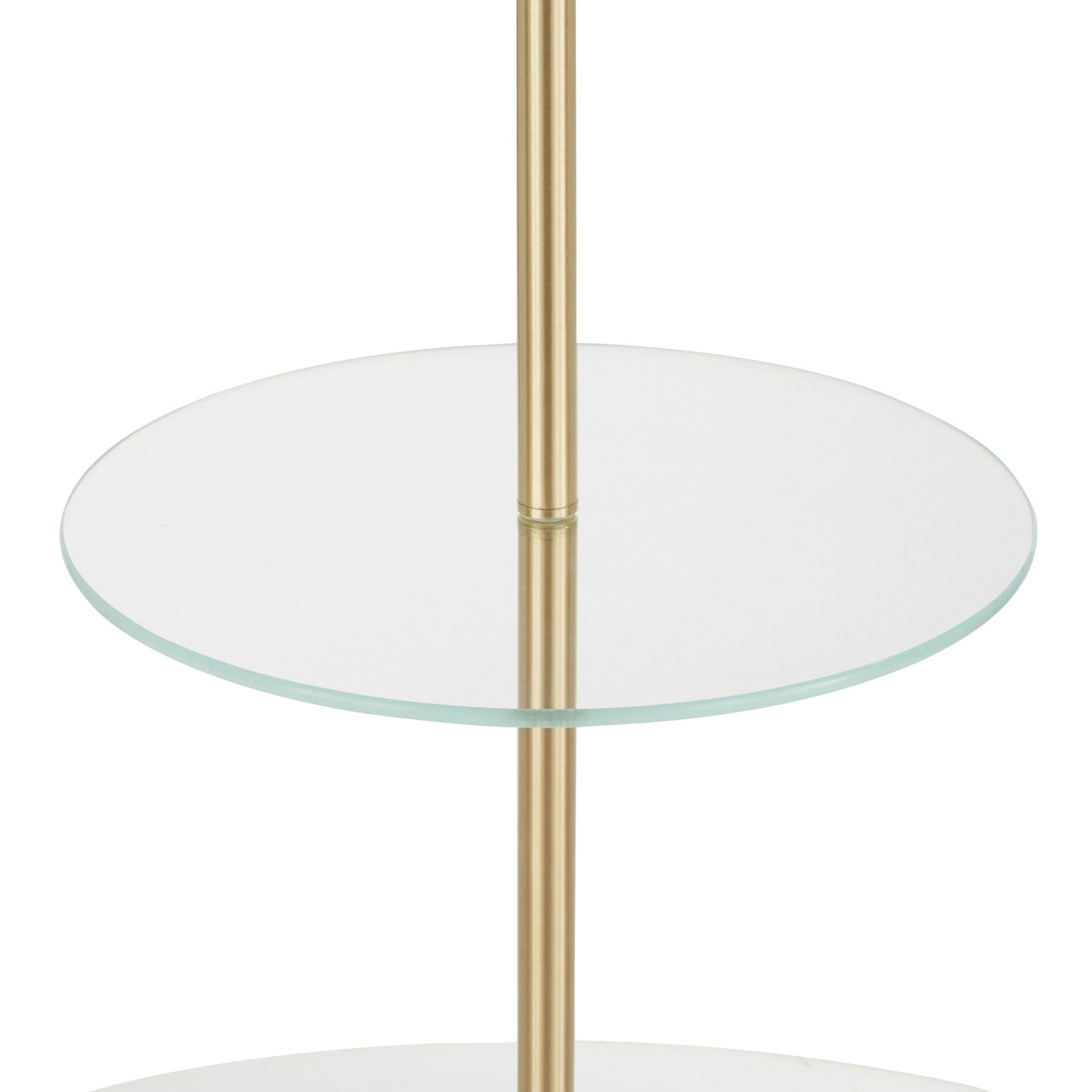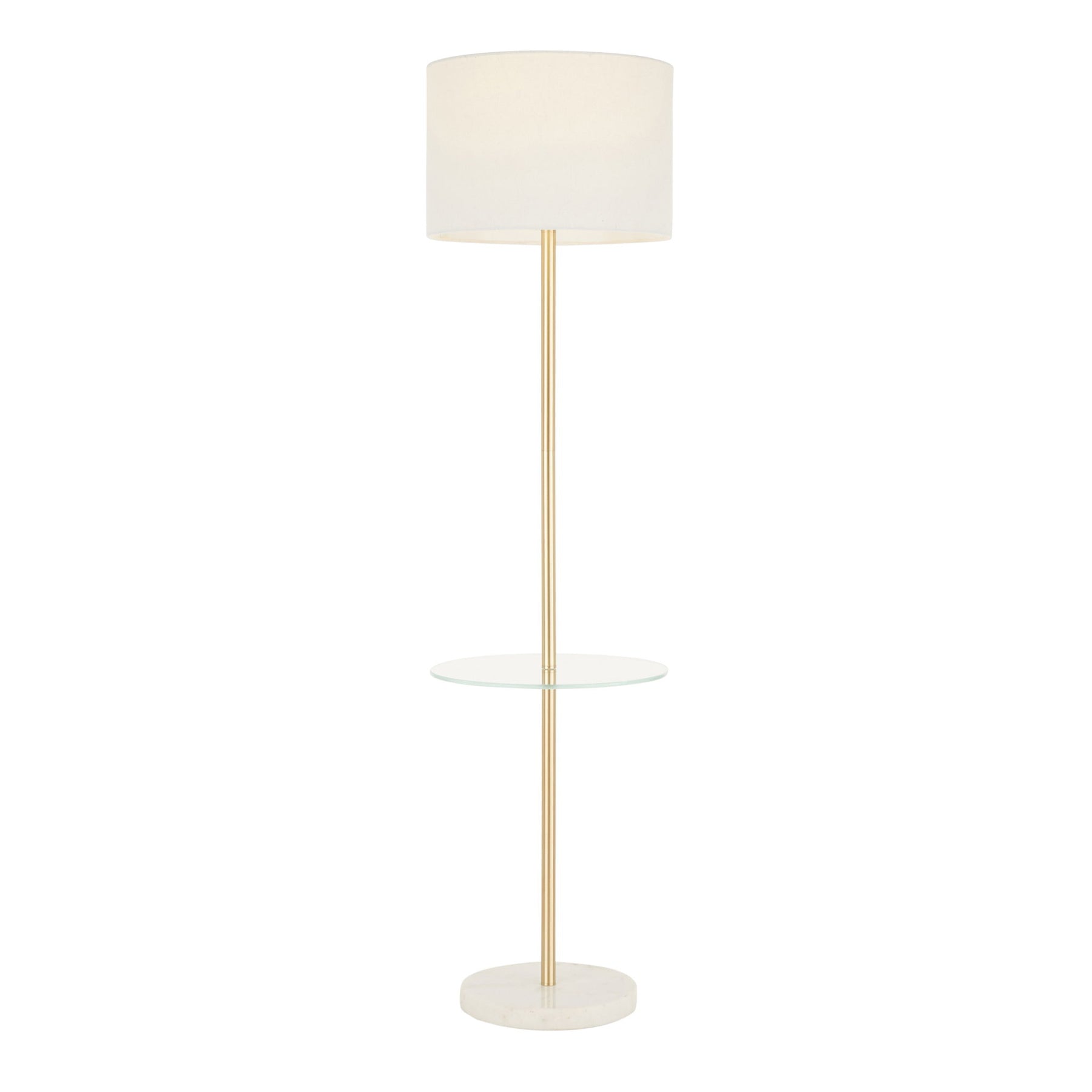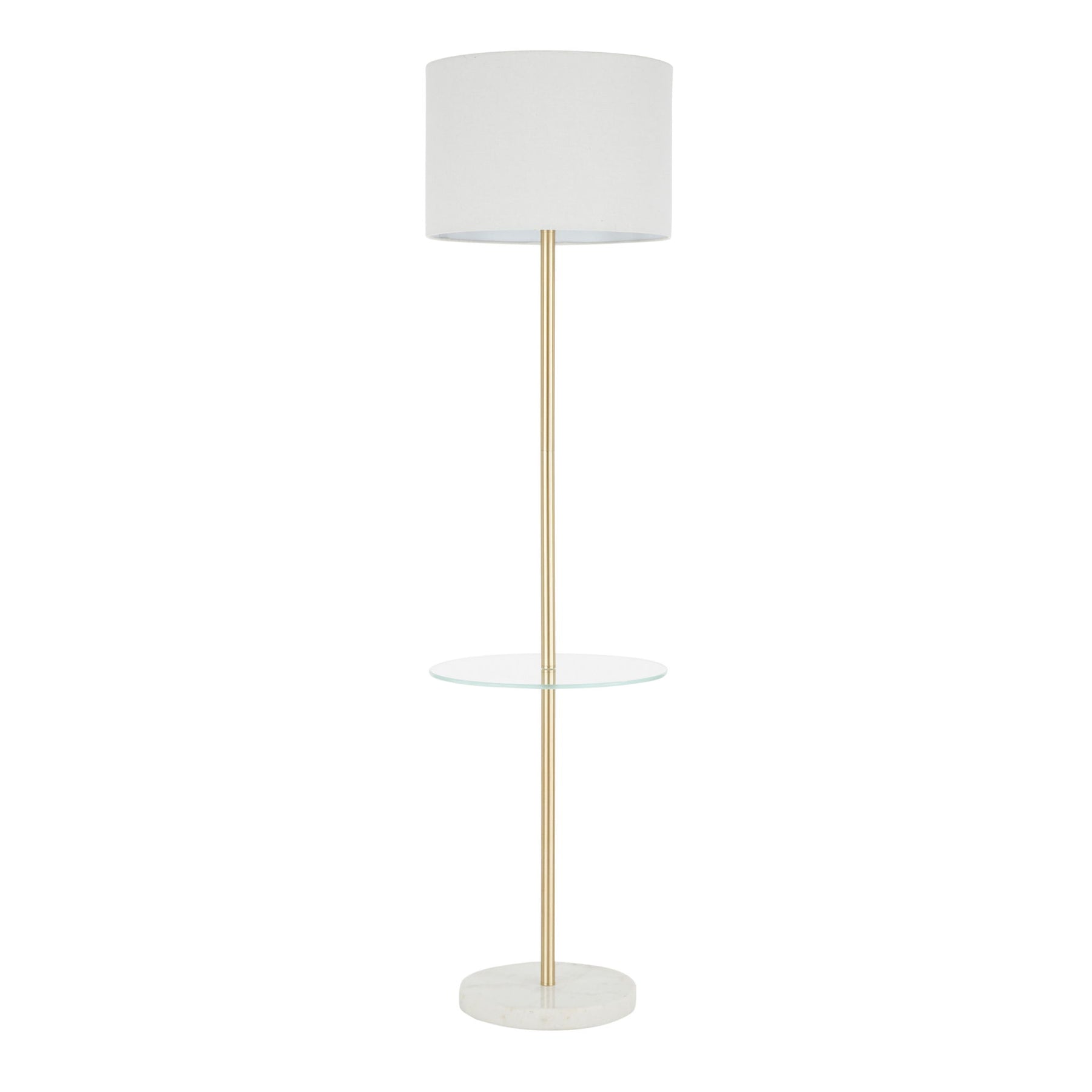 - Sleek and Functional Design: The Chloe Shelf Floor Lamp by LumiSource features a modern design with a gold neck, round glass shelf, marble base, and white linen shade, perfect for adding a stylish touch to any space.