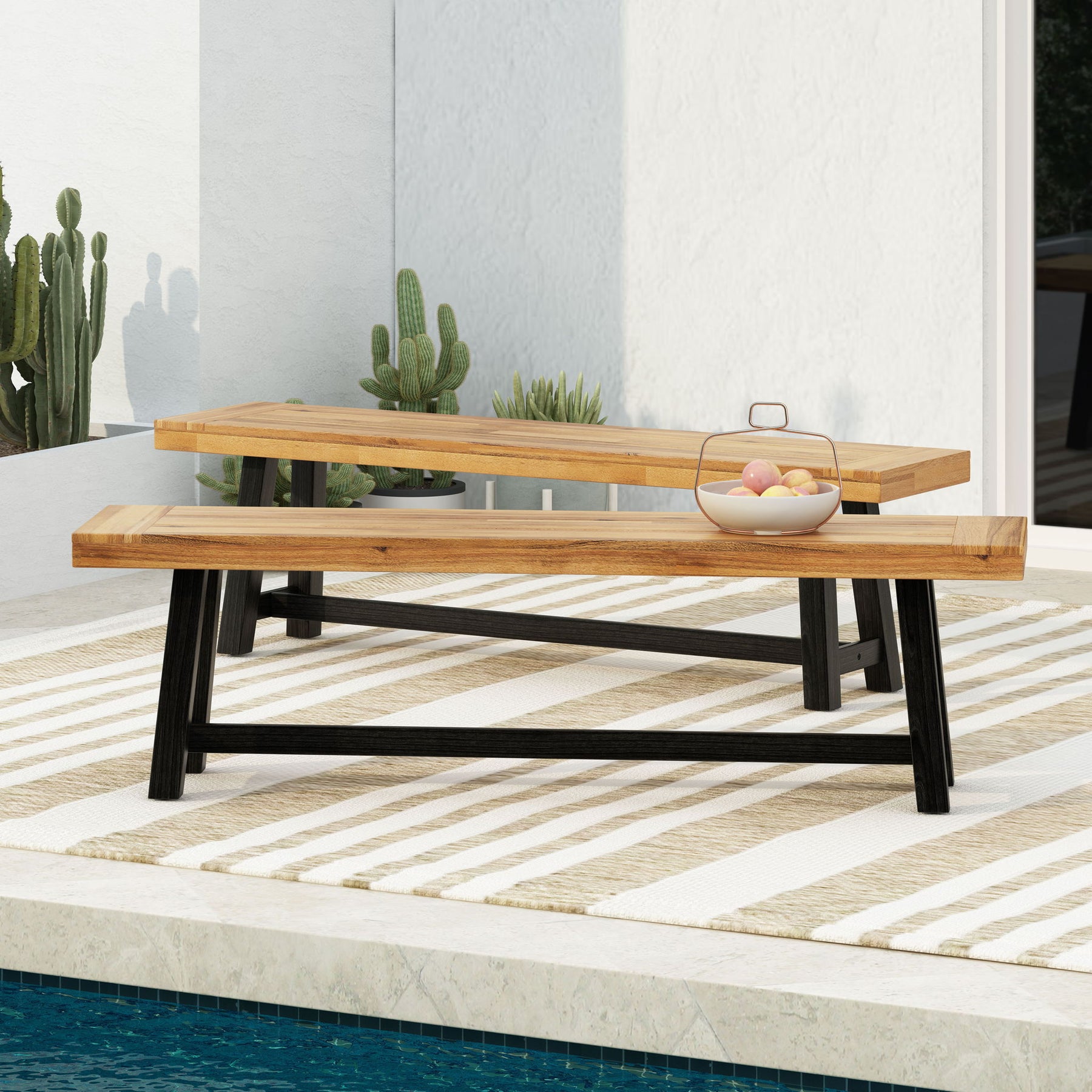 Cloud - Outdoor Bench With Acacia Wood Frame And Slat Panel Design (Set of 2) - Sandblast Teak / Black