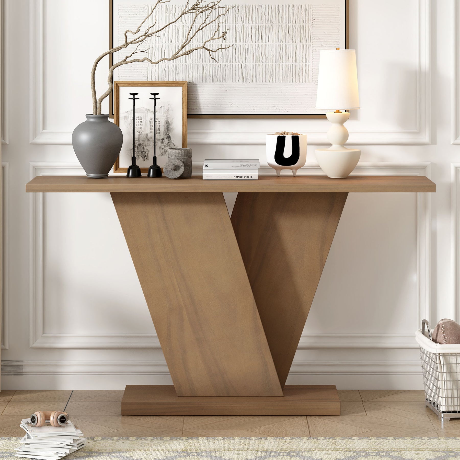 Console Table With V Shape Base / Natural Wood Veneer, Sculptural Entryway Accent - Brown