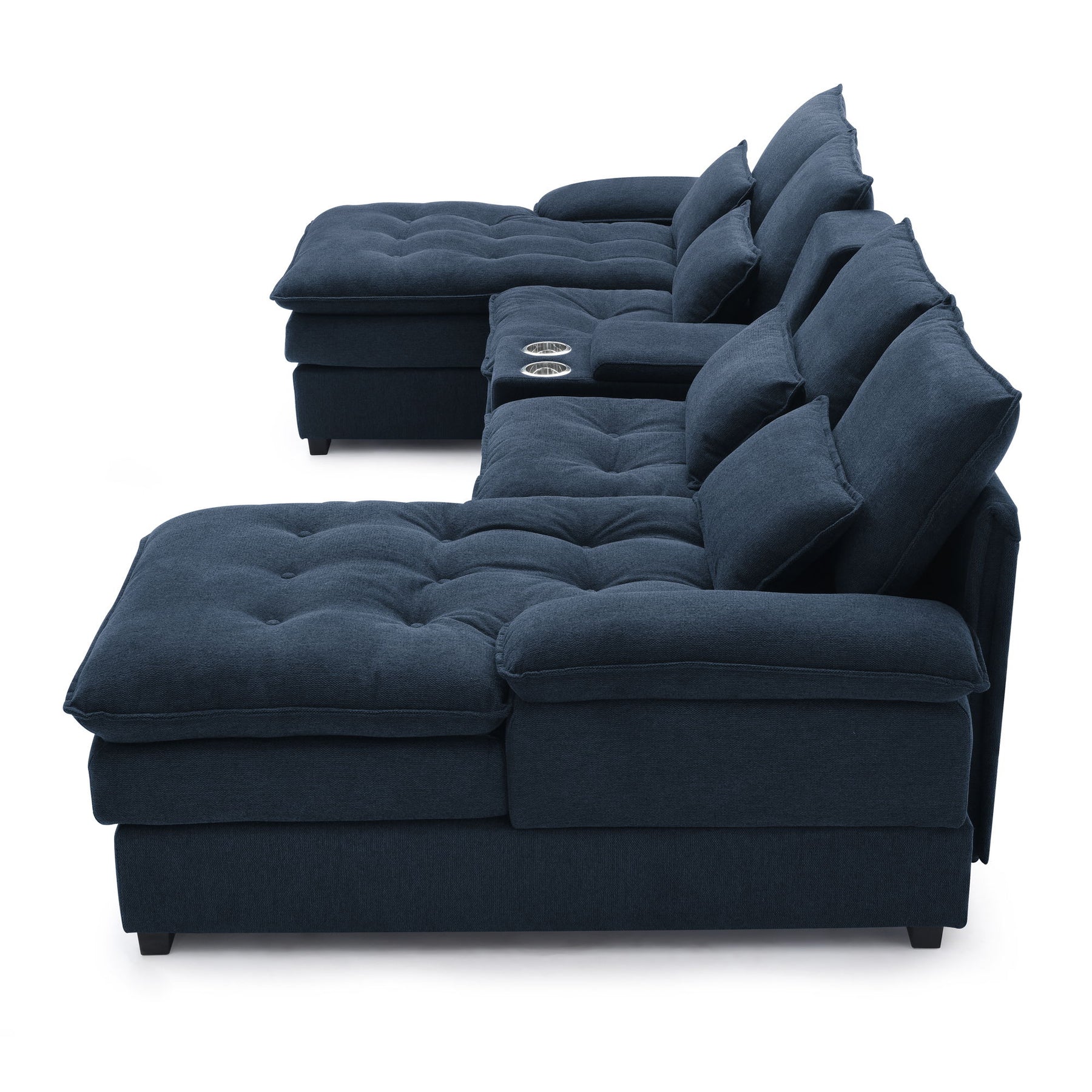 Upholstered U Shaped Sofa With Console And Cupholders - Blue