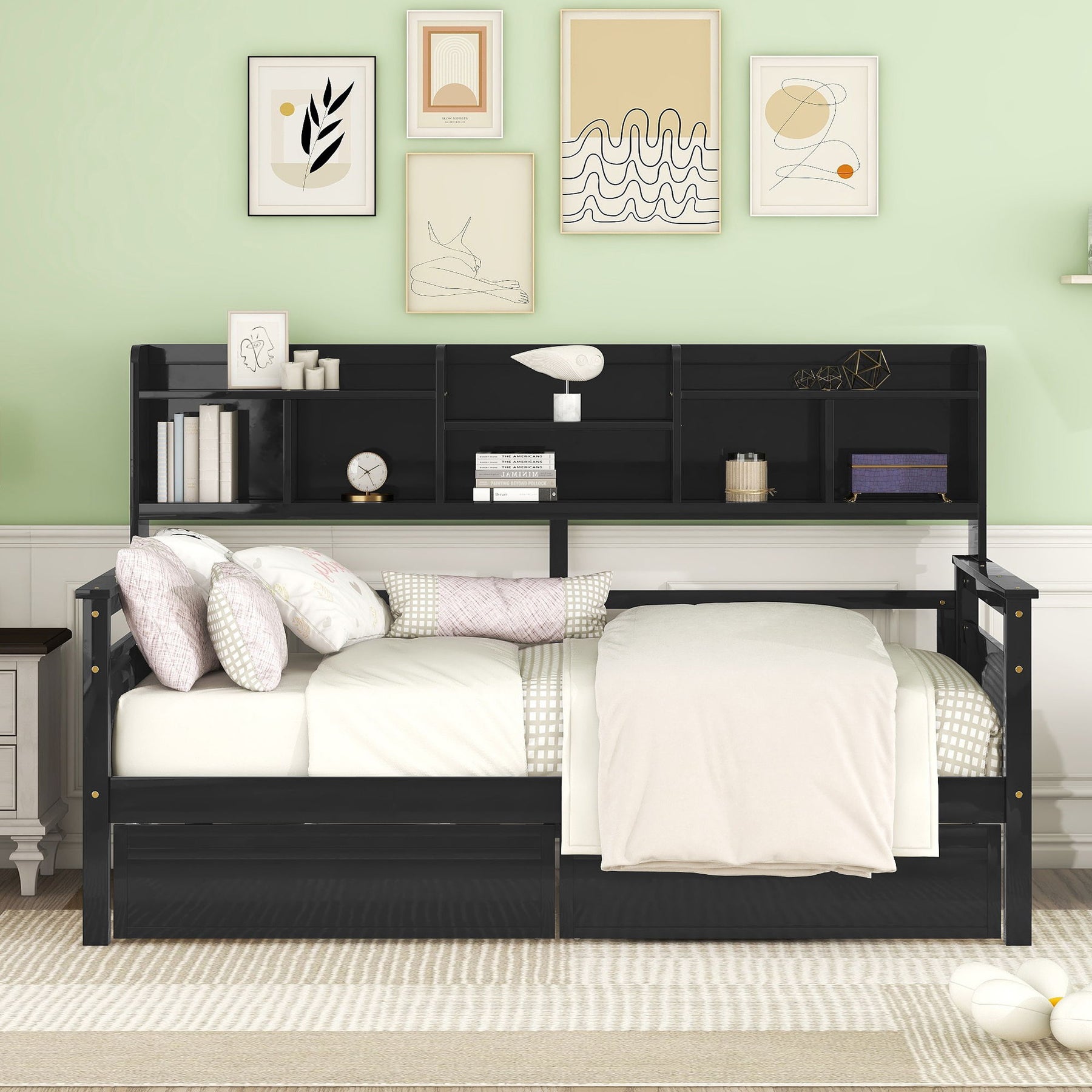 Twin Size Daybed, Slat Support, With Bedside Shelves And 2 Drawers - Espresso