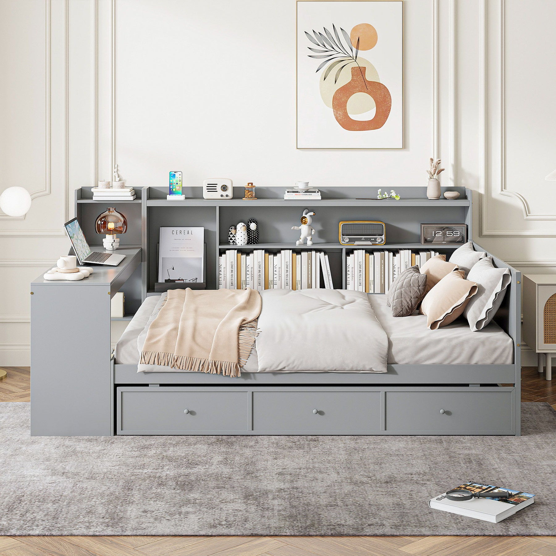 Twin Size Daybed With 3 Drawers USB Ports And Desk - Gray