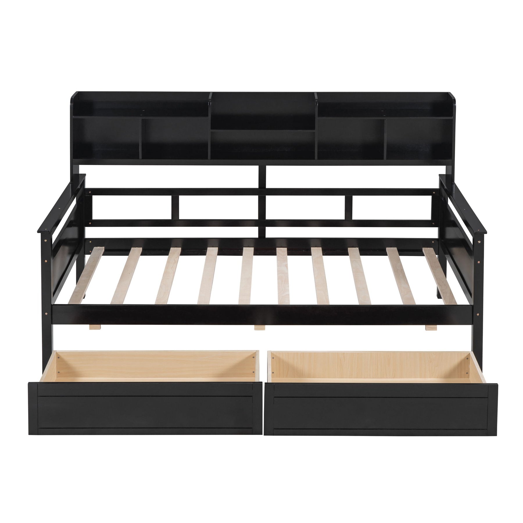 Twin Size Daybed, Slat Support, With Bedside Shelves And Two Drawers - Espresso