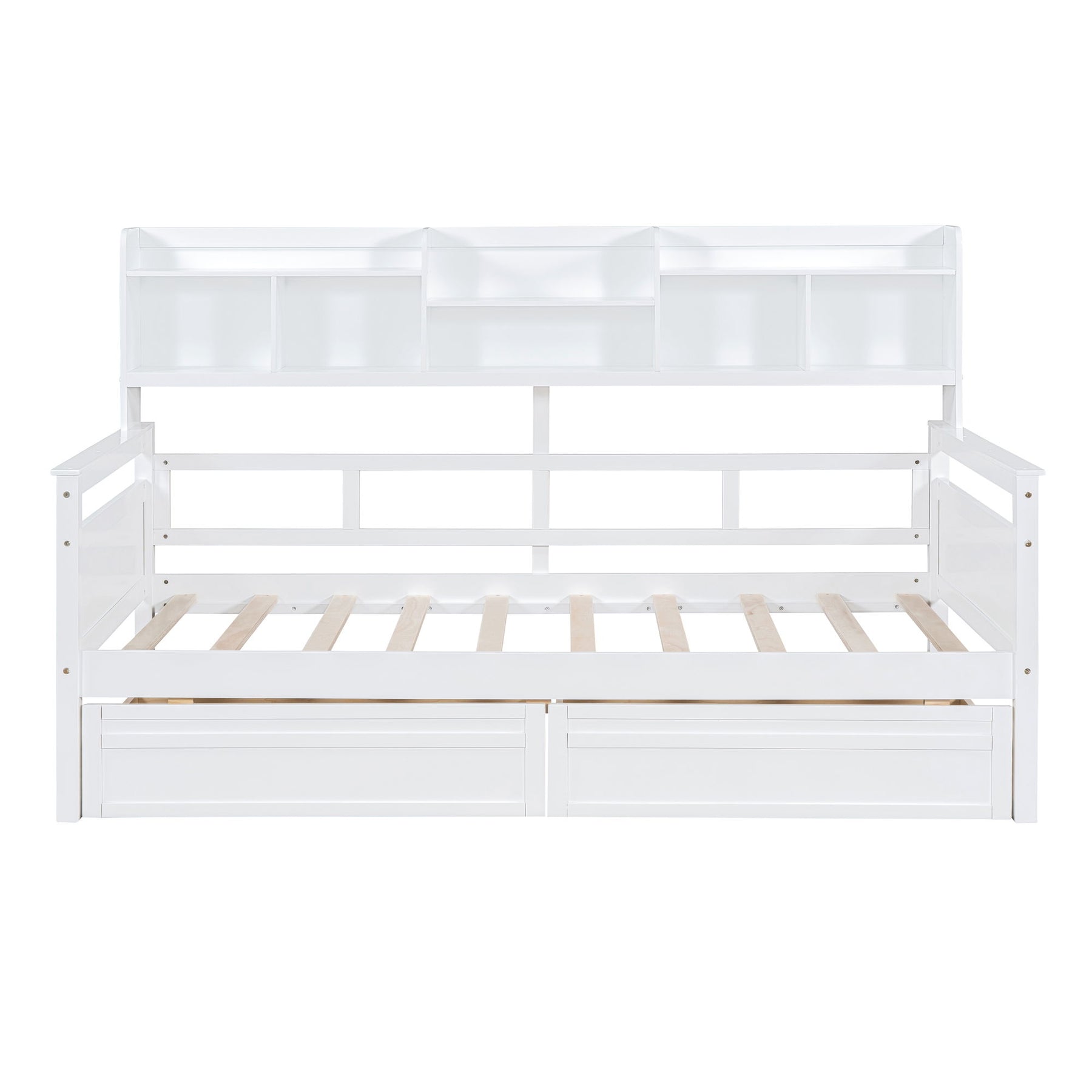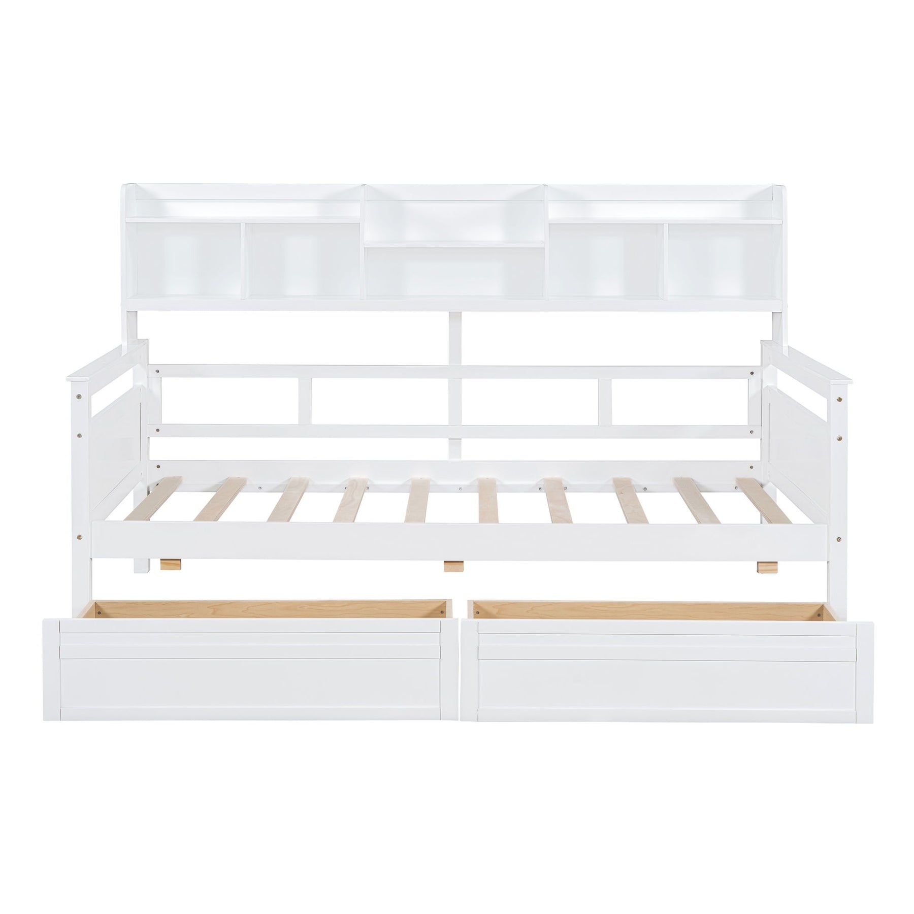 Twin Size Daybed, Slat Support, With Bedside Shelves And Two Drawers - White