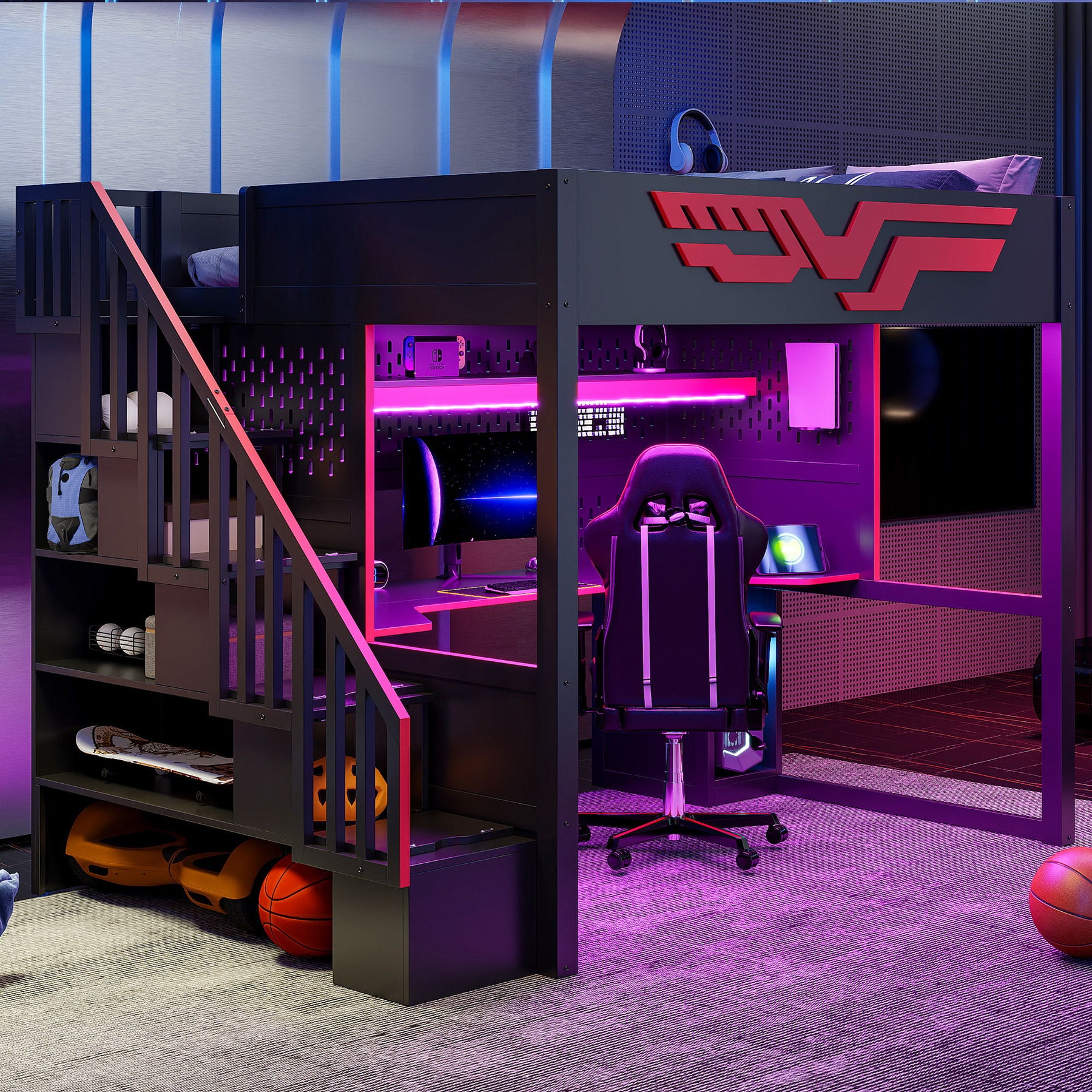 - Built-in Gaming Workstation: Dedicated desk area supports monitor and console setup with a strong gaming aesthetic.