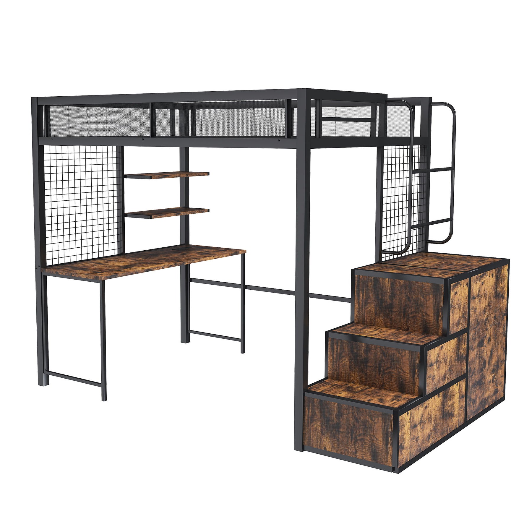 Heavy Duty Full Loft Bed With Desk & USB Charging Metal Frame With Storage Drawers And Staircase - Black