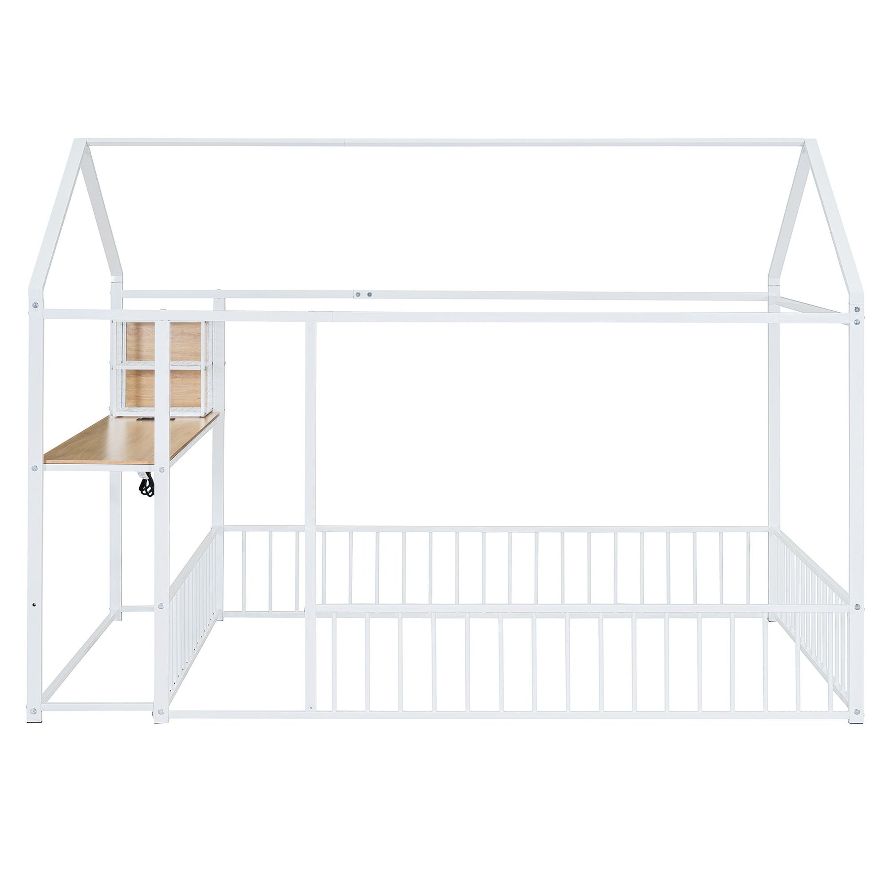 Full Size Bed House Frame With Desk, Shelves, Power Outlets And USB Ports - White