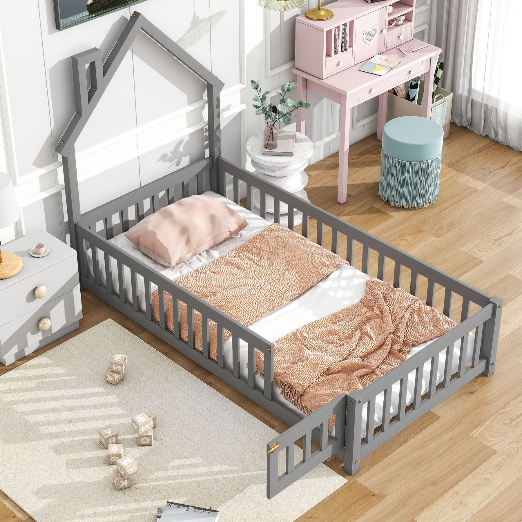 Twin House-Shaped Headboard Floor Bed With Fence - Gray
