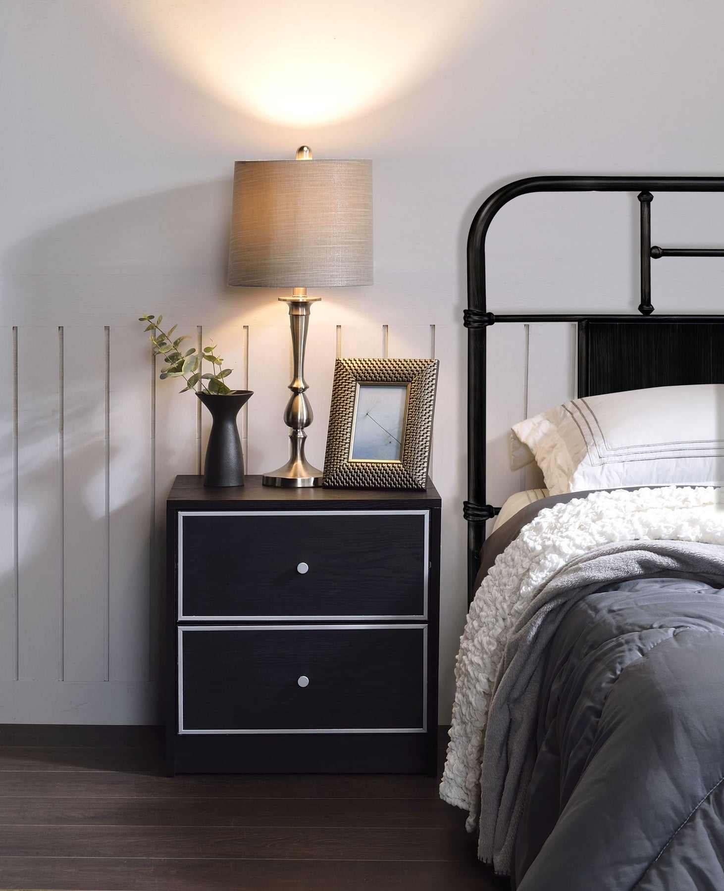 • Elegant Design: This accent table boasts a sleek black finish, complemented by silver-colored line accents on the front of its metal slide drawers, offering a touch of elegance and sophistication to its overall design.
