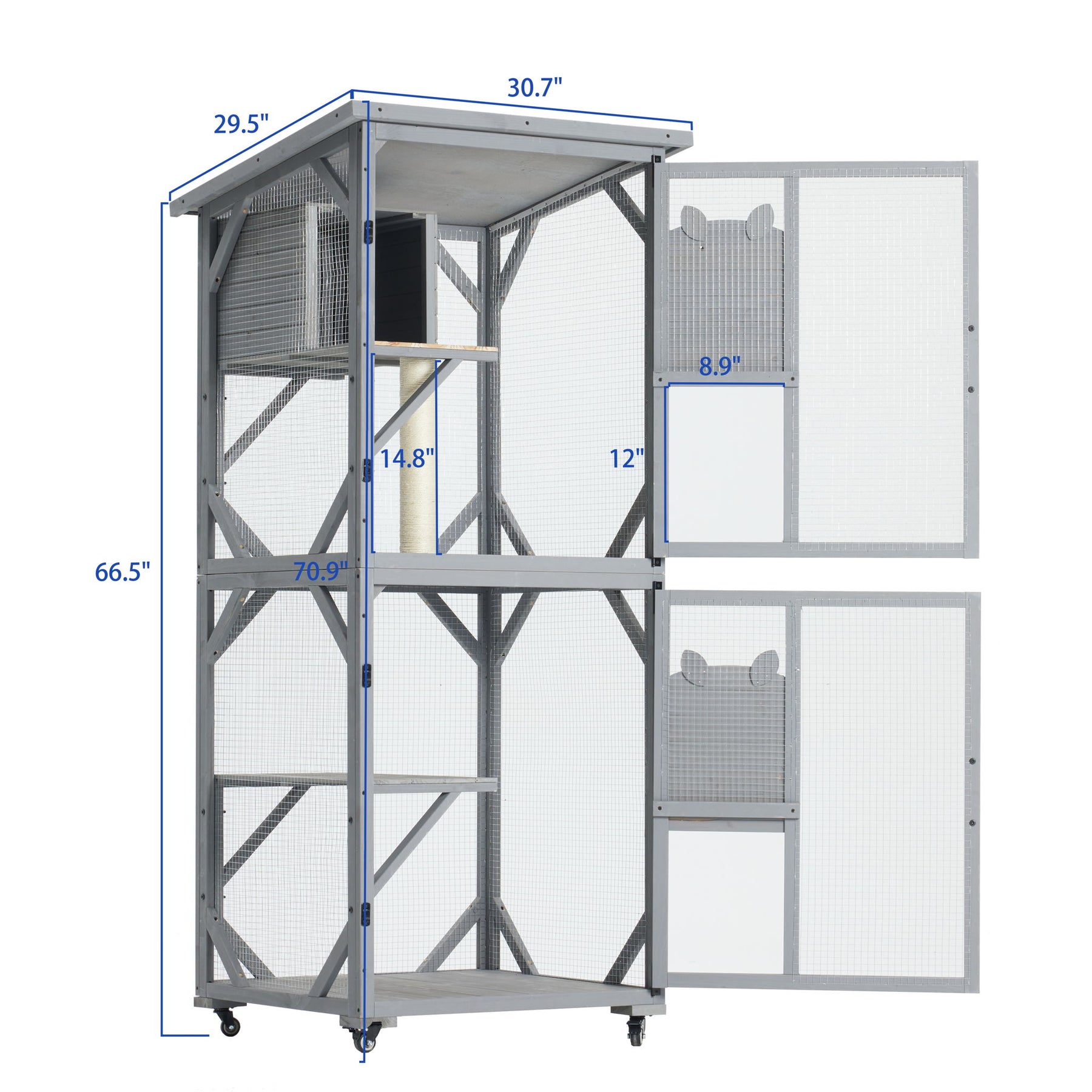 Large Cat House Outdoor Catio Cat Enclosures On Wheels, Kitty House With Upgraded Resting Box Waterproof Roof - Gray