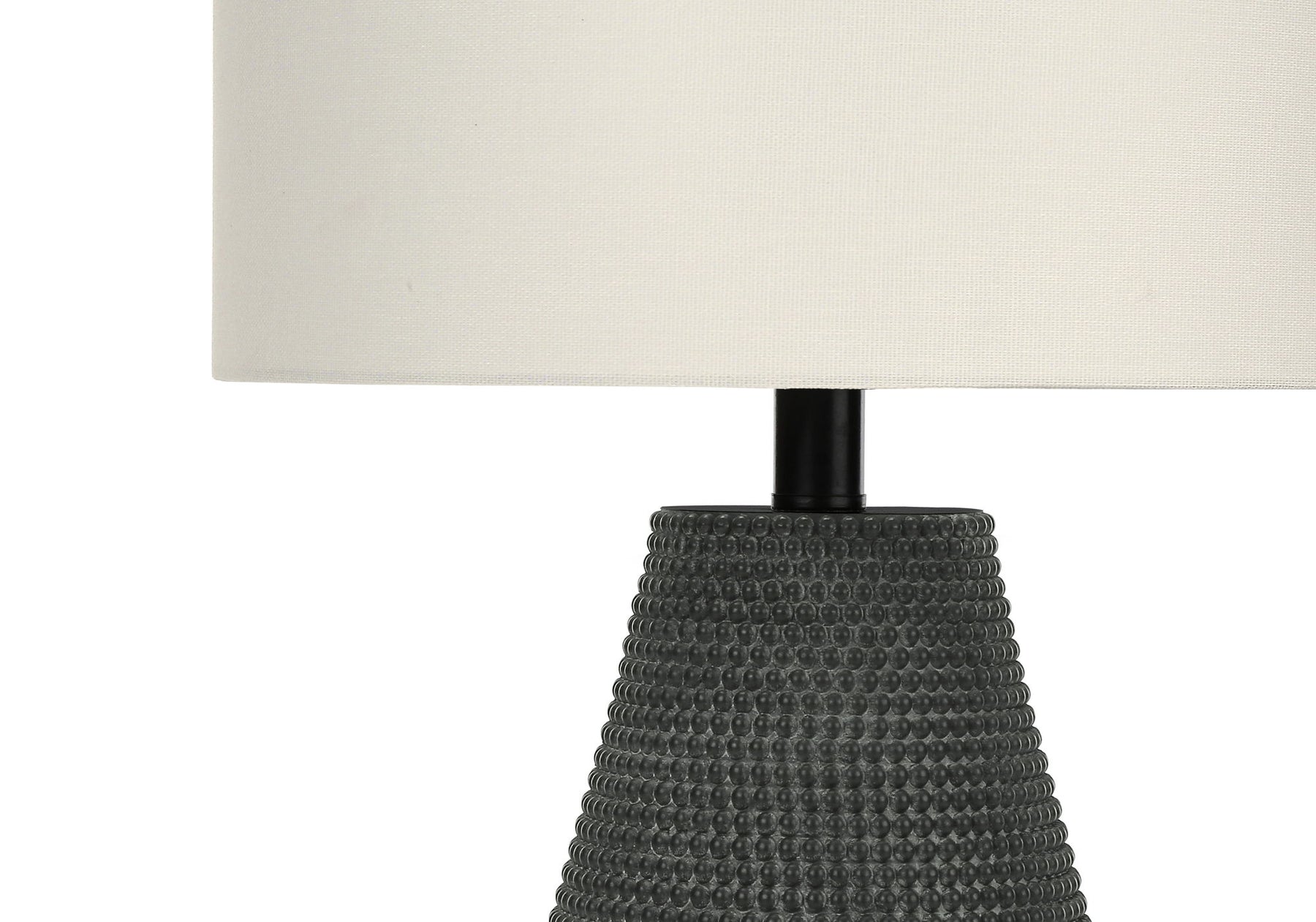 - Contemporary Design: 24" high table lamp with a black resin base featuring a raised, dotted textured finish and an ivory fabric drum shade.