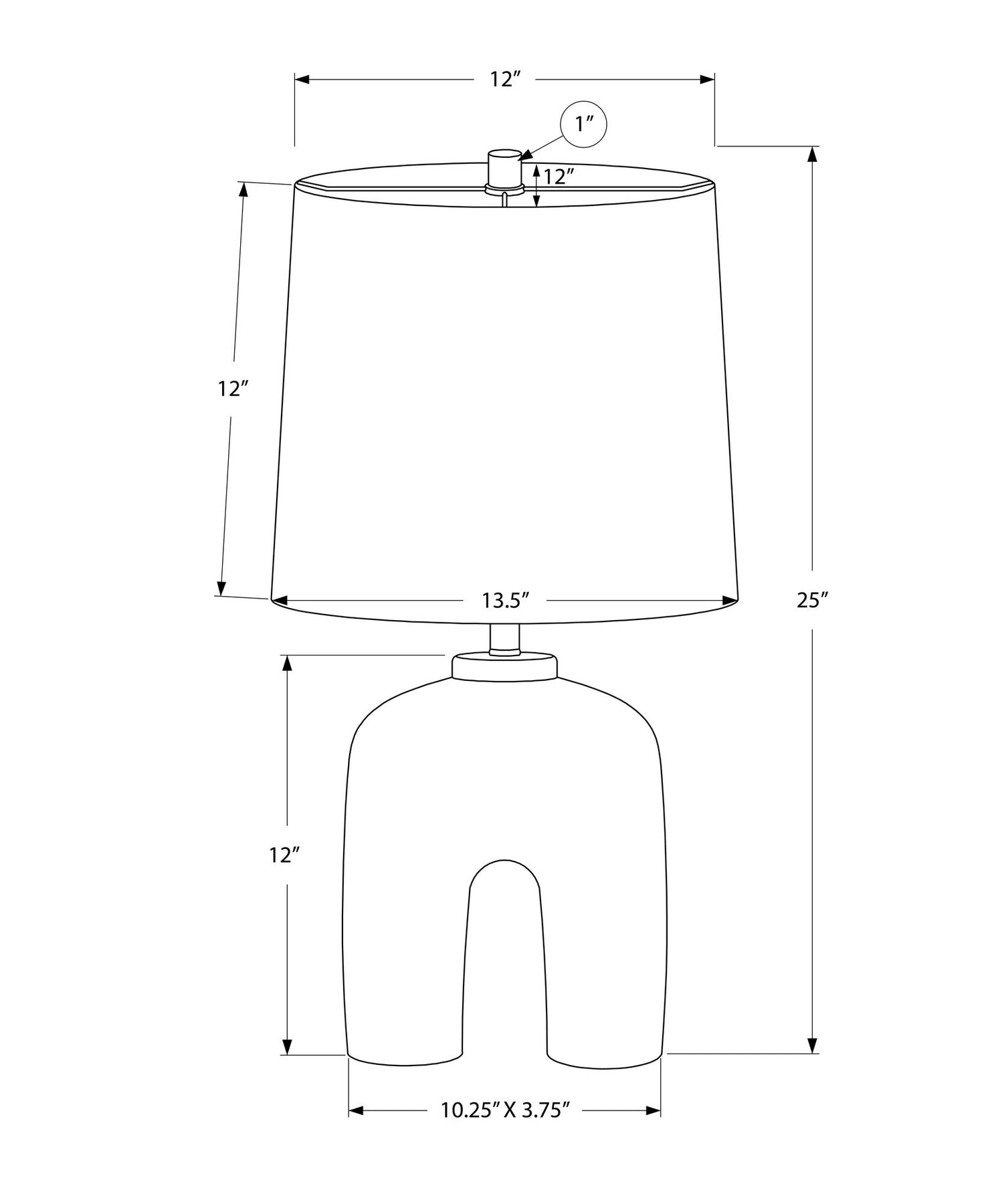 - Dimensions: Overall size is 13.5" L x 13.5" W x 25" H; base measures 10.25" L x 3.75" W x 12" H; shade dimensions are 13.5" L x 13.5" W x 12" H.