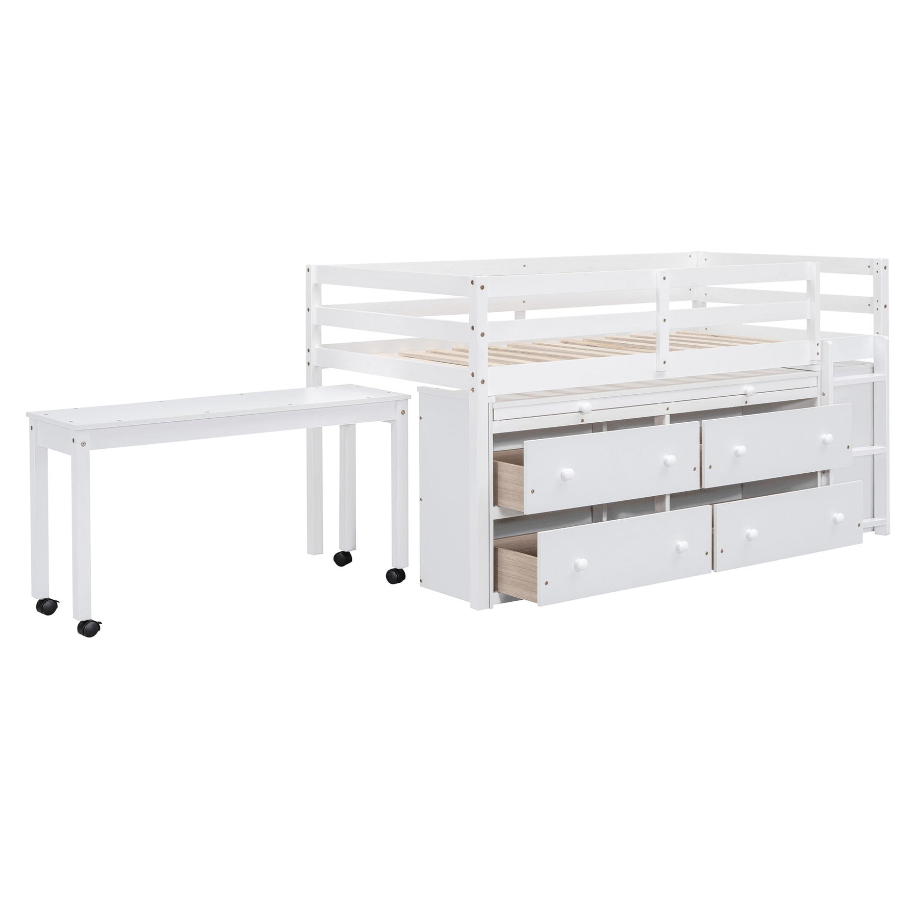 Full Size Loft Bed With Retractable Writing Desk And 4 Drawers, With Lateral Portable Desk And Shelves - White