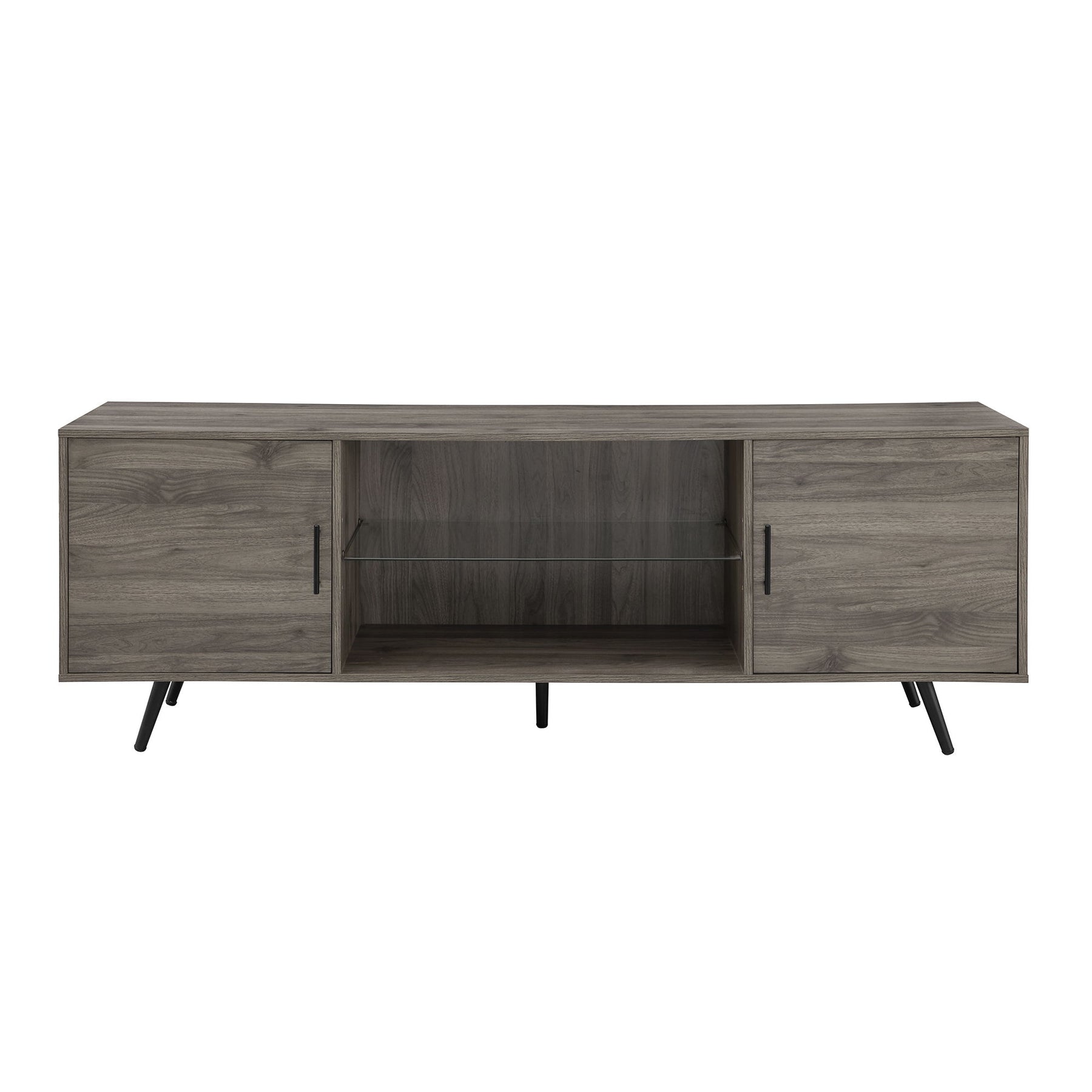 Mid-Century Modern 2 Door 70" TV Stand For 80" TVs With Glass Shelf - Slate Gray