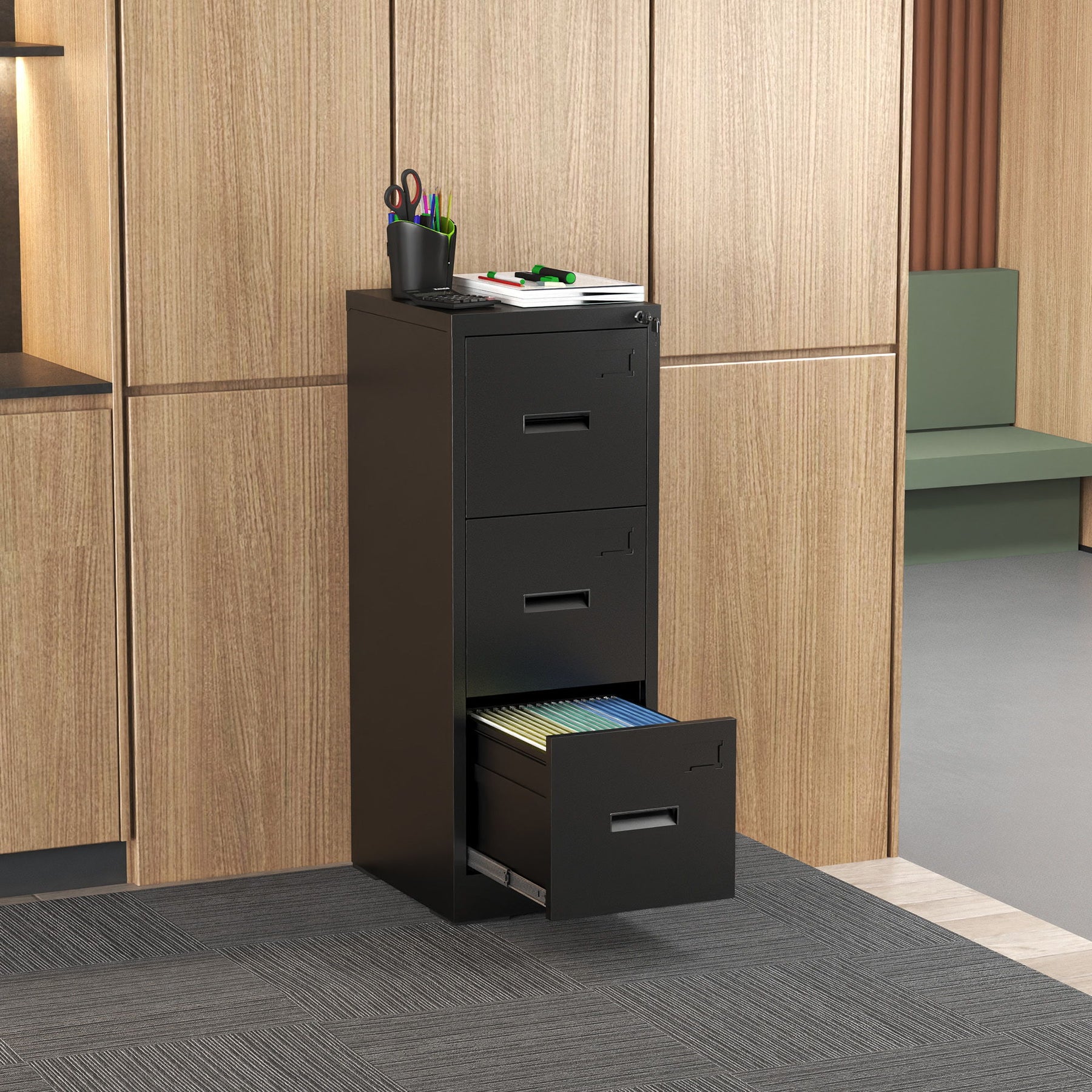 Metal Vertical File Cabinet With Lock And Card Slot For A4 Legal / Letter Size, Durable Steel - Black