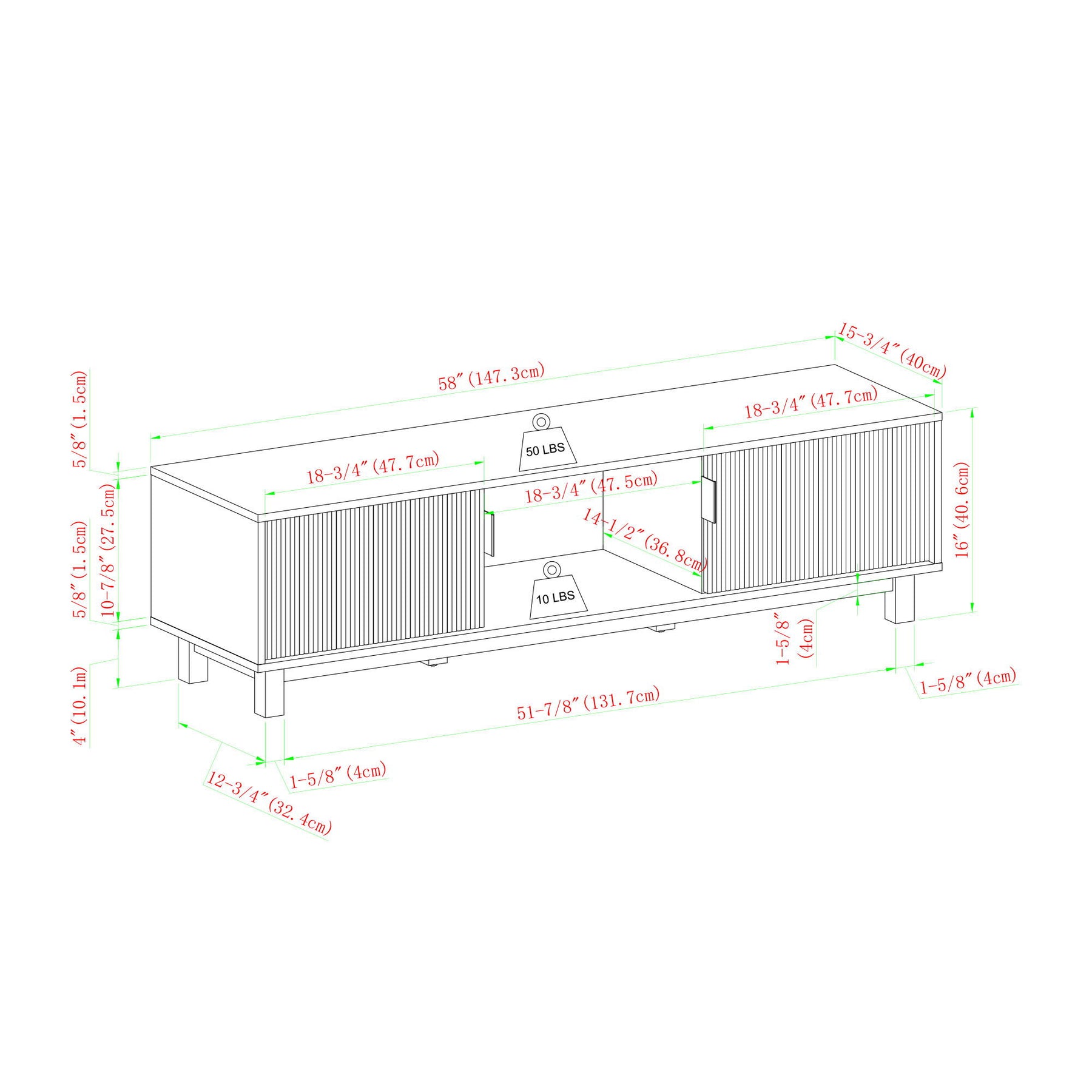 58.0"W x 15.75"D x 16.0"H - 57.0 lb