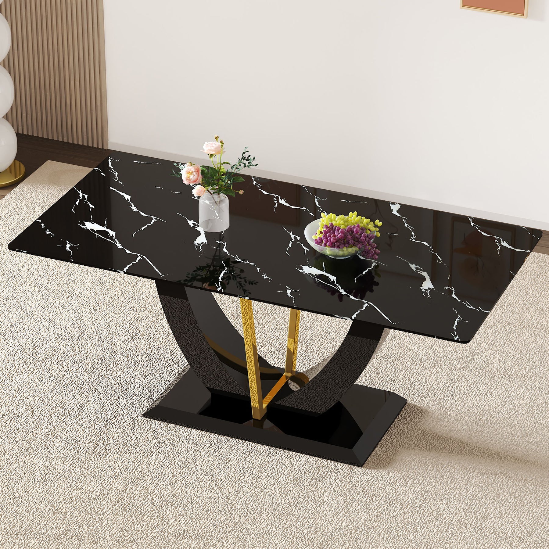 Modern Minimalist Luxurious Imitation Marble Dining Table Rectangular Office Desk With Tempered Glass - Black