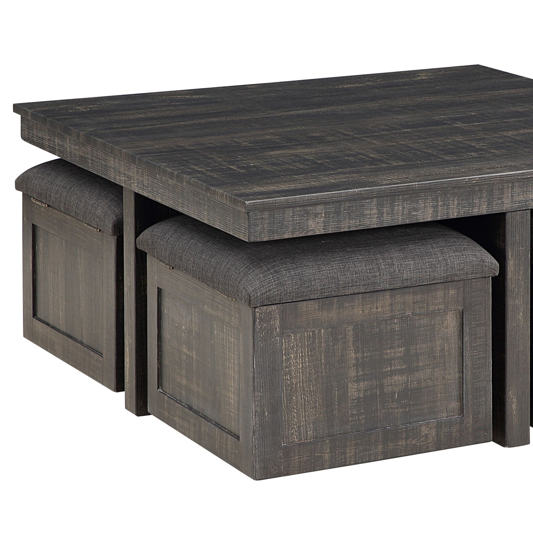 • The Moseberg Coffee Table with storage stools is the perfect set for the center of your living space gathering. This cocktail coffee table provides a large surface for drinks and other necessities. Works great for boardgame nights. The stools can also be used as extra seating or foot stools for you and your guests and nestle neatly underneath the coffee table when not in use. The stools also feature storage for stowing away other essentials. Style and functionality all in one!