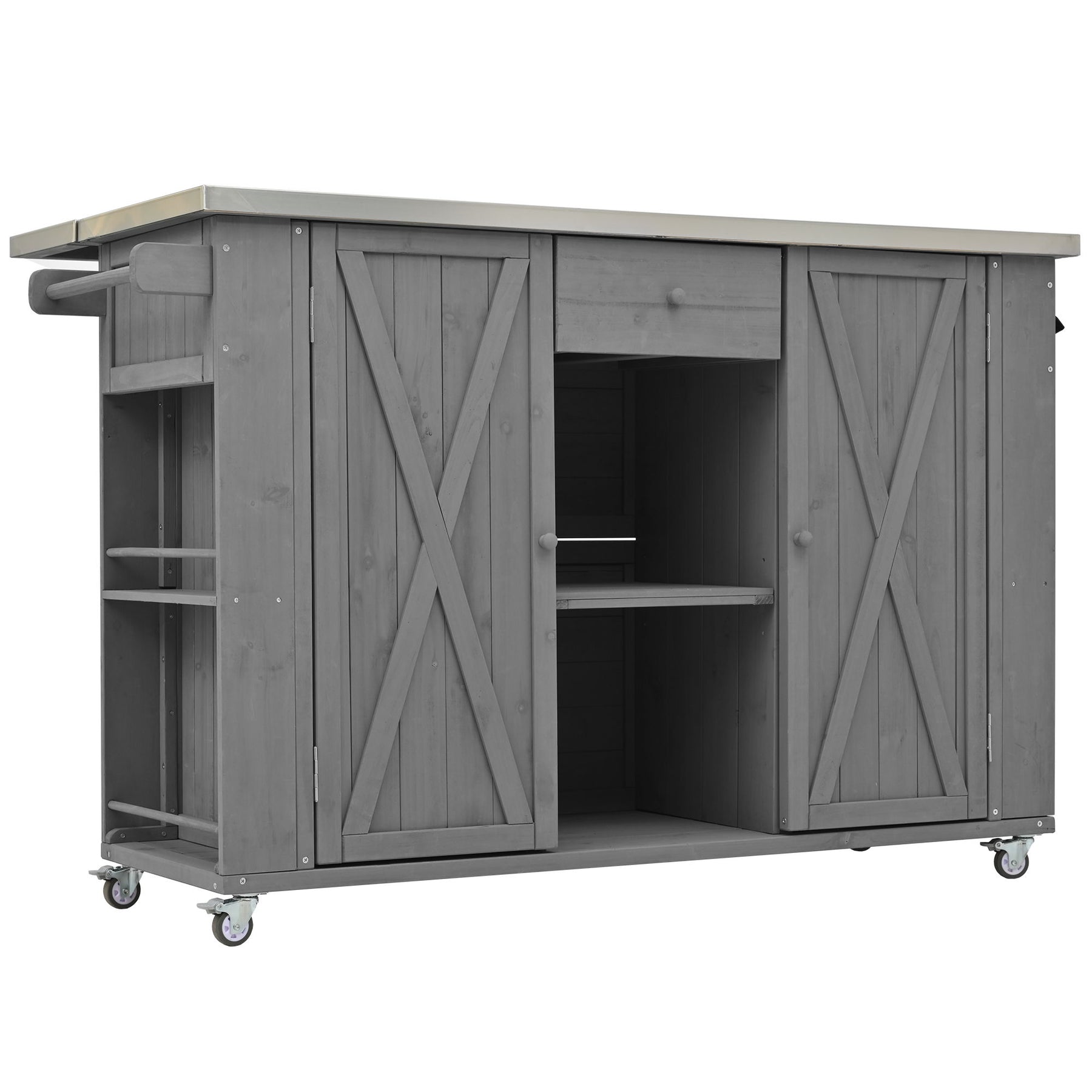 Outdoor Kitchen Island Fir Wood Kitchen Island With Stainless Steel Top, Ample Storage Space, Towel And Spice Racks And A Bottle Opener For Outdoor - Gray