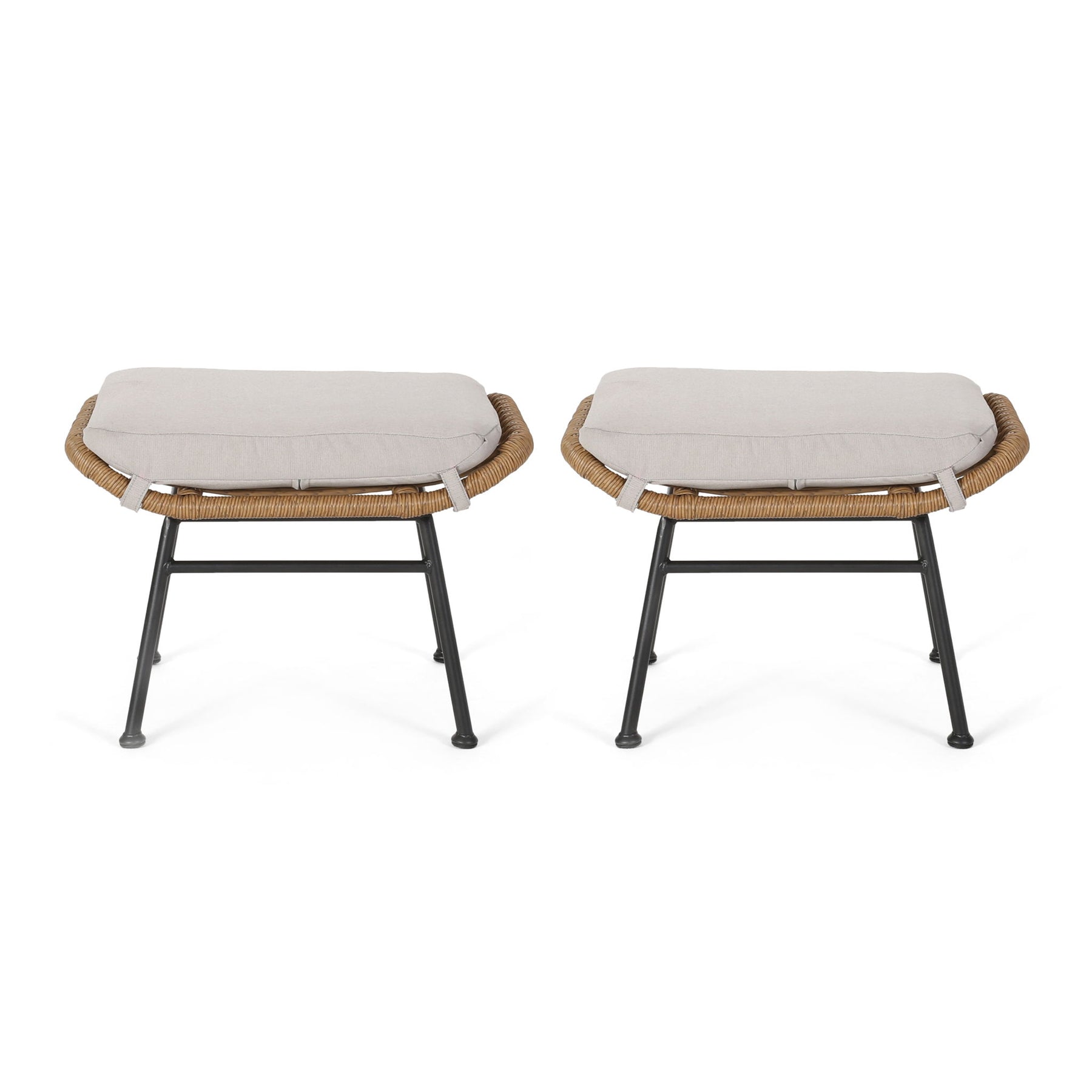 Outdoor Modern Boho Wicker Ottoman With Cushions (Set of 2) - Gray