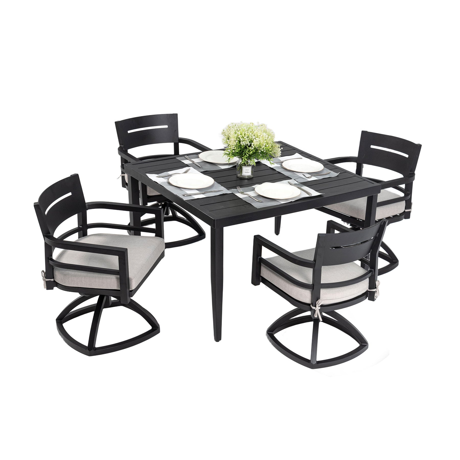 - Modern Minimalist Design: The dining set boasts a sleek design with streamlined swivel rock bases and tapered post legs. This modern aesthetic adds elegance to outdoor spaces, ensuring stability and blending seamlessly with various décor styles.