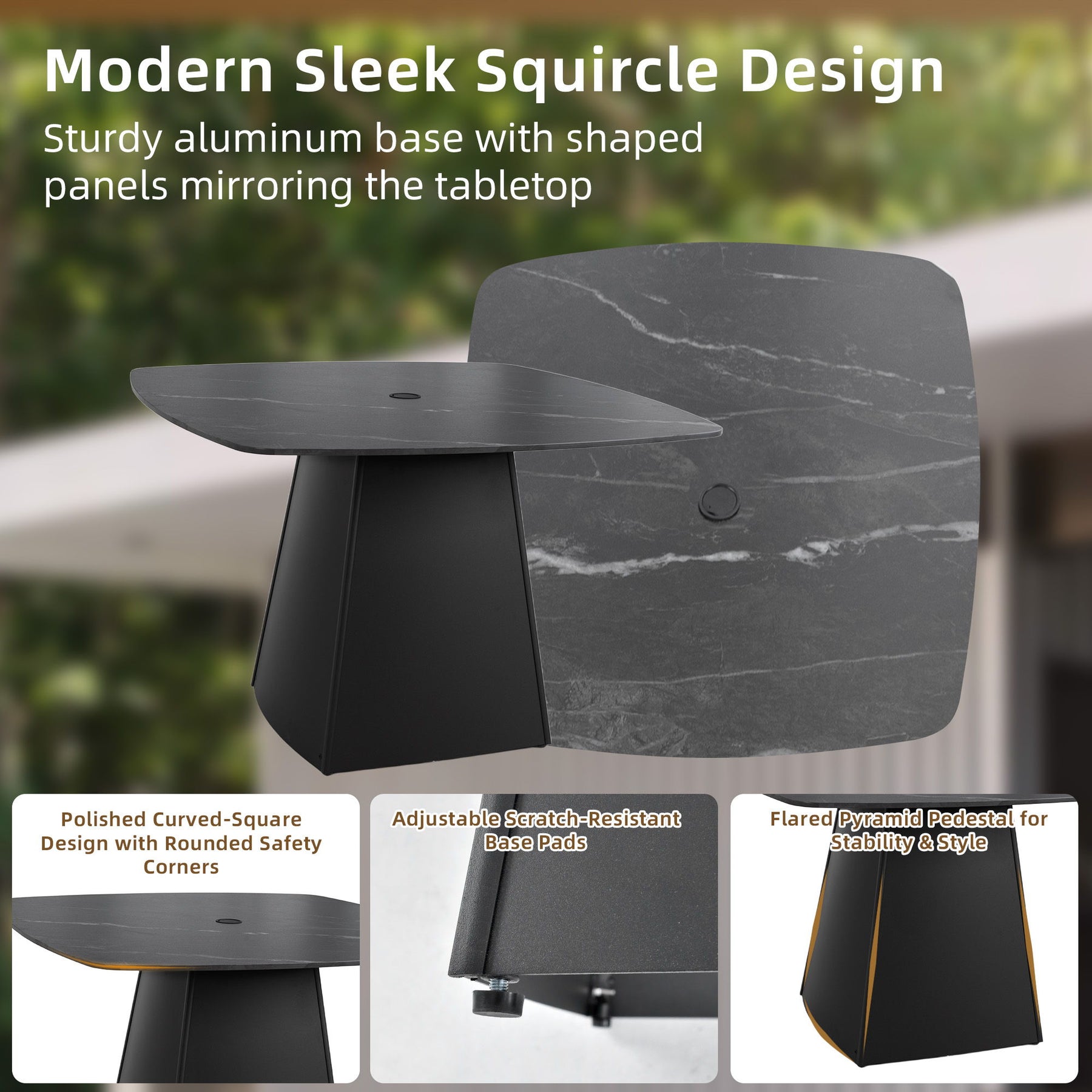 - Stylish & Safe Tabletop Details: marble-inspired finish with softly curved square shape, polished edges, and chamfered corners for added safety and style; includes 2" umbrella hole with a matching aluminum cap.