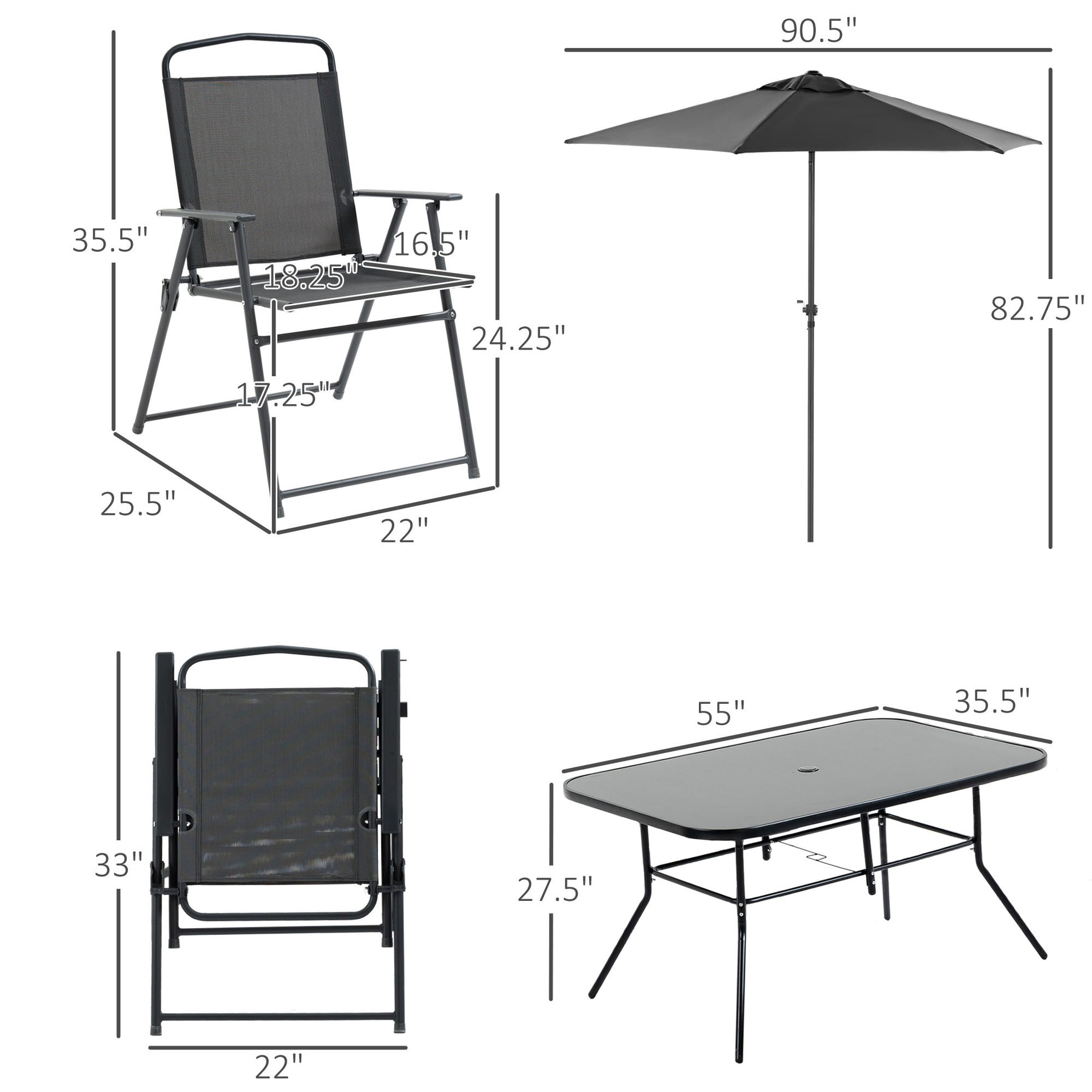 Outsunny - 6 Piece Patio Dining Set For 4 With Umbrella, Outdoor Table And Chairs With 4 Folding Dining Chairs & Round Glass Table For Garden, Backyard And Poolside - Black