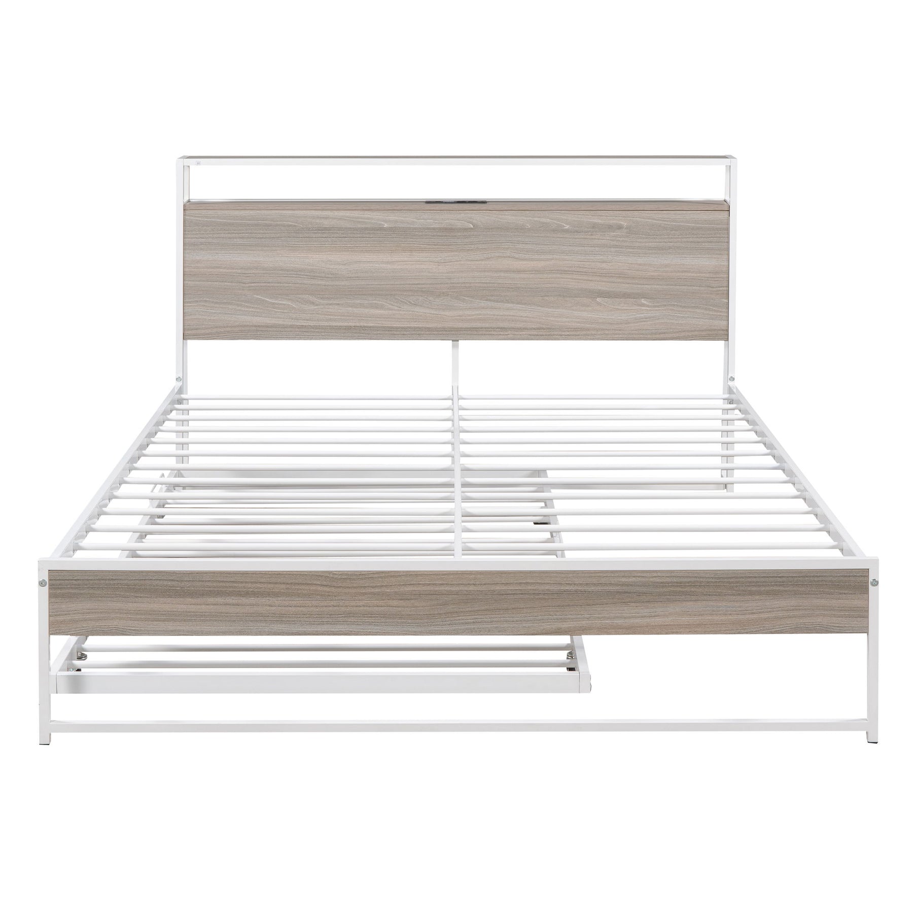Queen Size Platform Bed Frame With Trundle, USB Ports And Slat Support, No Box Spring Needed - White