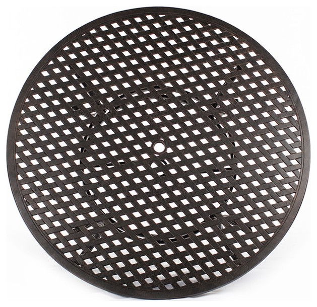 - Durable and Classic Design: Rust-proof aluminum construction ensures long-lasting elegance. Classic lattice-patterned table top with an umbrella hole.