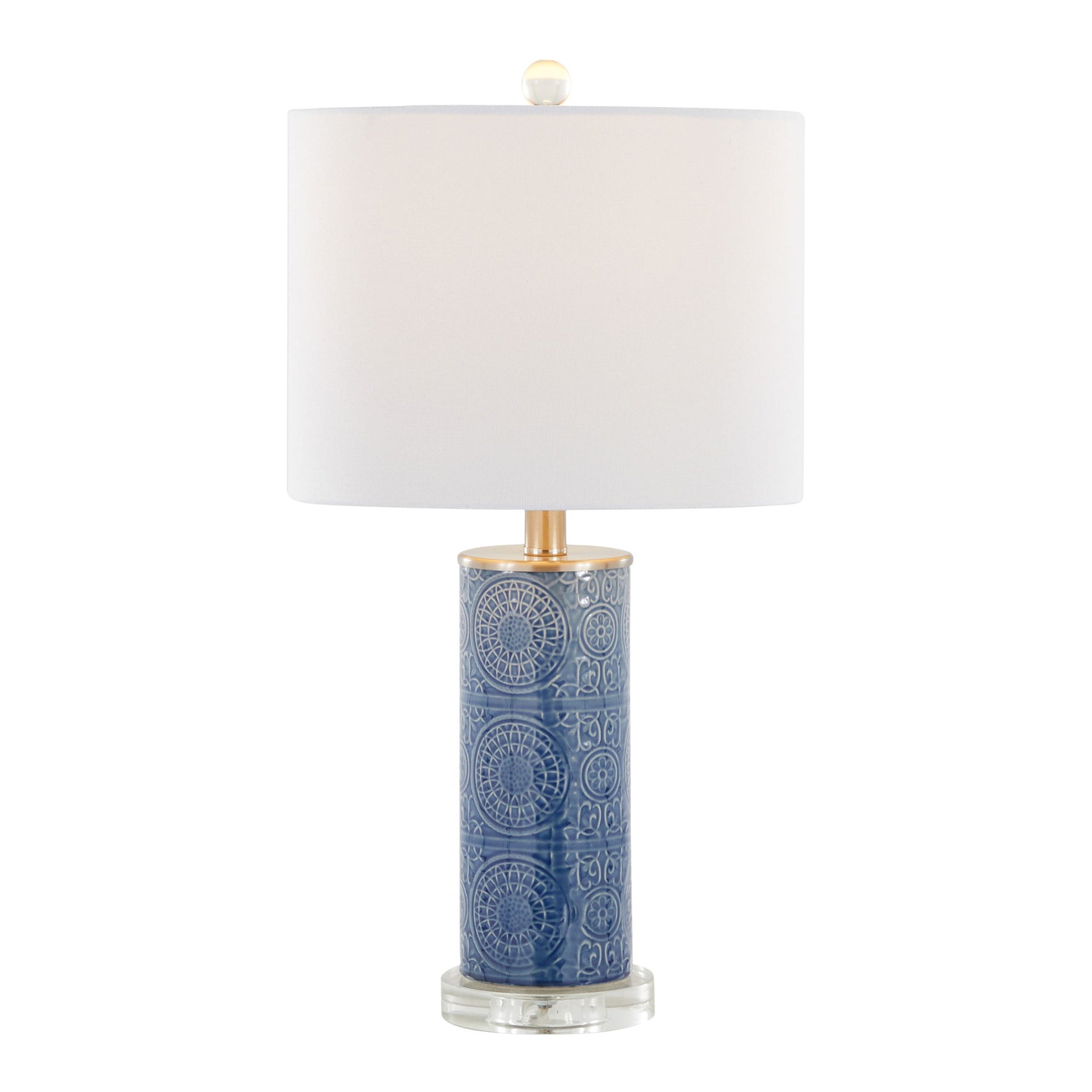 - Stylish Design: The Spyro Table Lamp features a unique cylindrical ceramic body with an embossed design, complemented by a genuine crystal base. Its contemporary style adds an eye-catching element to any room, whether it's a bedroom, living room, or office.