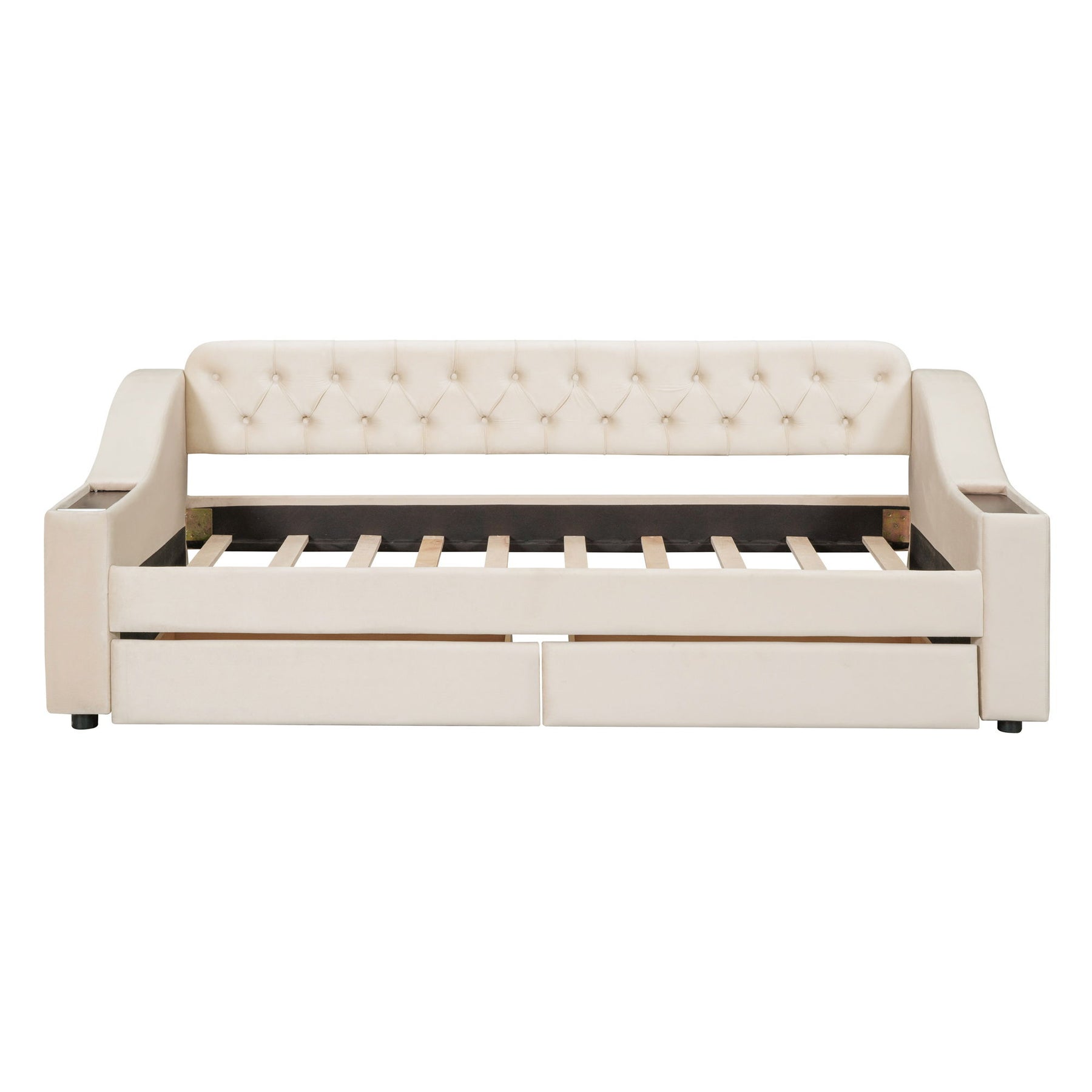 Twin Size Upholstered Daybed With Storage Armrests And USB Port - Beige