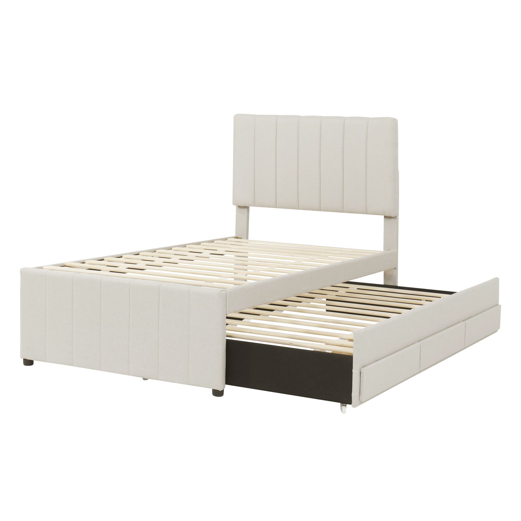 Twin Size Upholstered Platform Bed With Trundle And 3 Drawers - Beige
