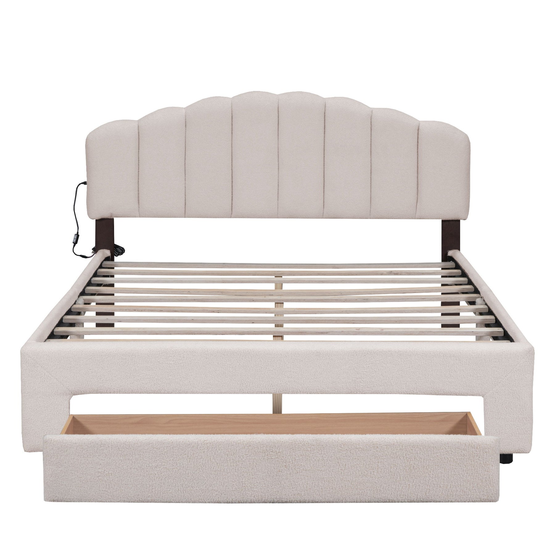 Queen Size Upholstered Platform Bed With Drawer - Beige