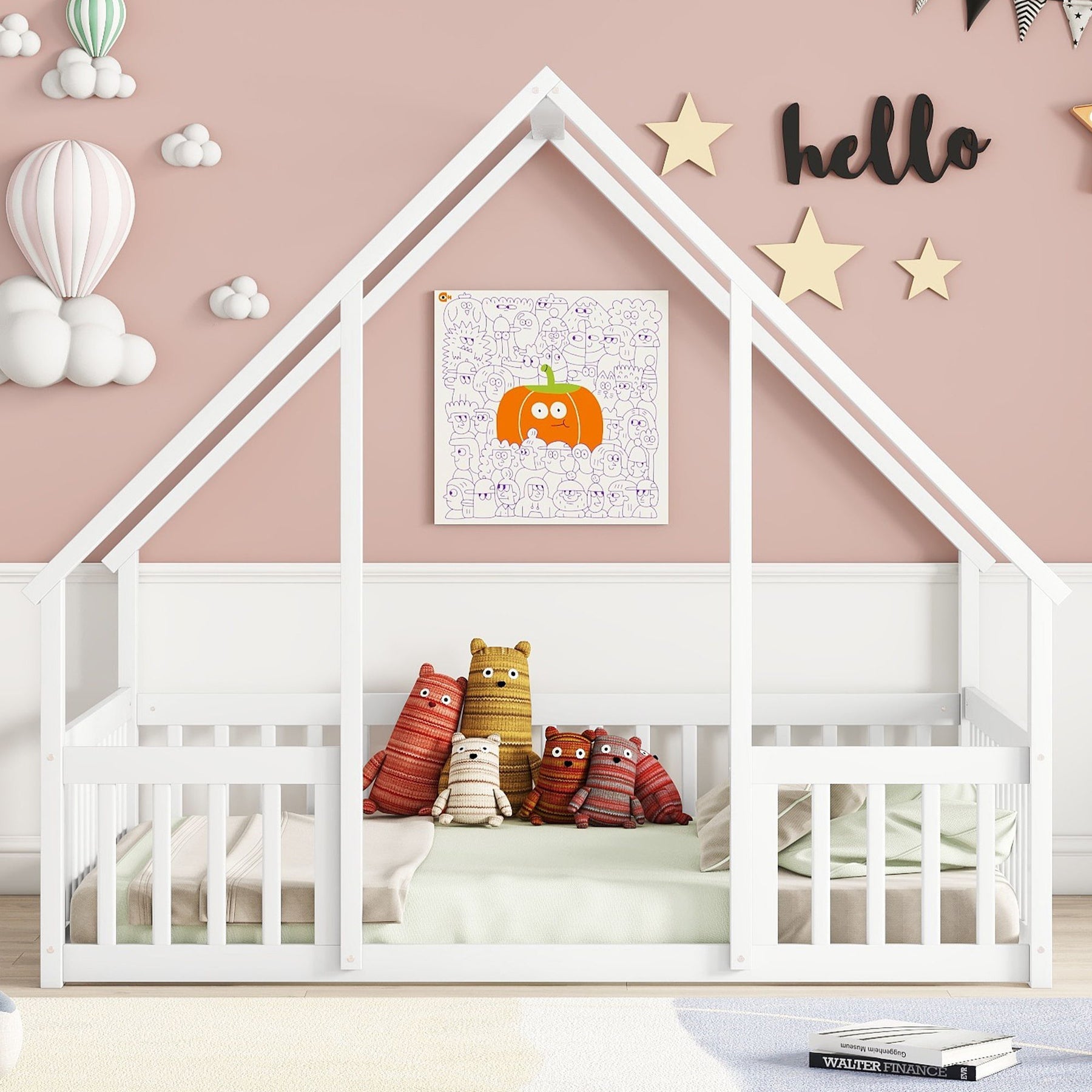 Twin Wood House-Shaped Floor Bed With Fence, Guardrails - White