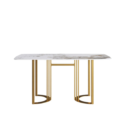 63" Modern Artificial Stone Panel Double-Ring Stainless Steel Metal Legs, Can Accommodate 6-8 People - White / Gold