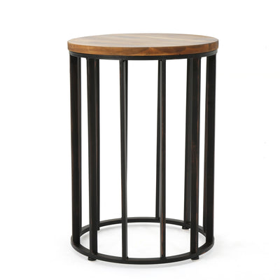 Outdoor Cylindrical Side Table With Round Solid Wood Top And Metal Frame - Natural
