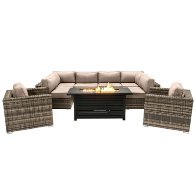 9 Piece Outdoor Sectional Set With Fire Pit Table And Cushions - Beige