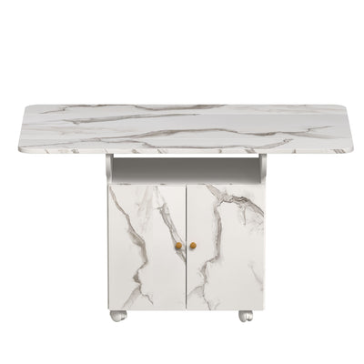 Versatile Marble Folding Dining Table With Storage Rack And Cabinet, 6 Wheels - White