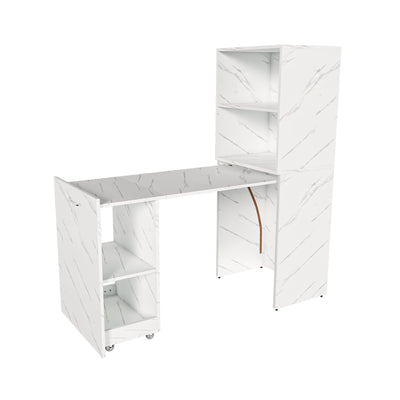 Stretchable Office Desk With Storage Shelves And Mobile Wheels, Foldable Design For Small Apartments - White Marble