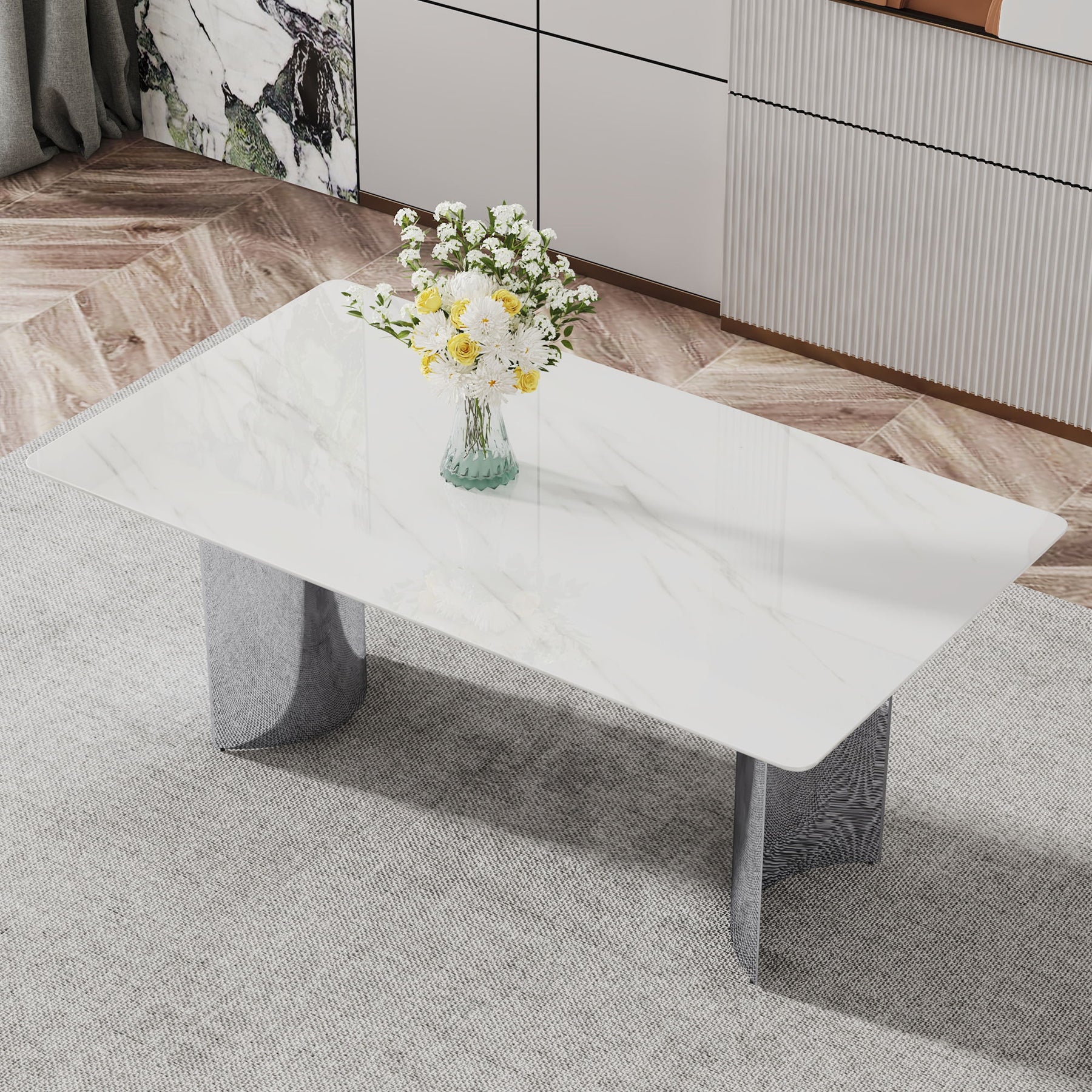 Modern Minimalist Dining Table With Imitation Marble Glass Desktop And Metal Legs - Silver / White