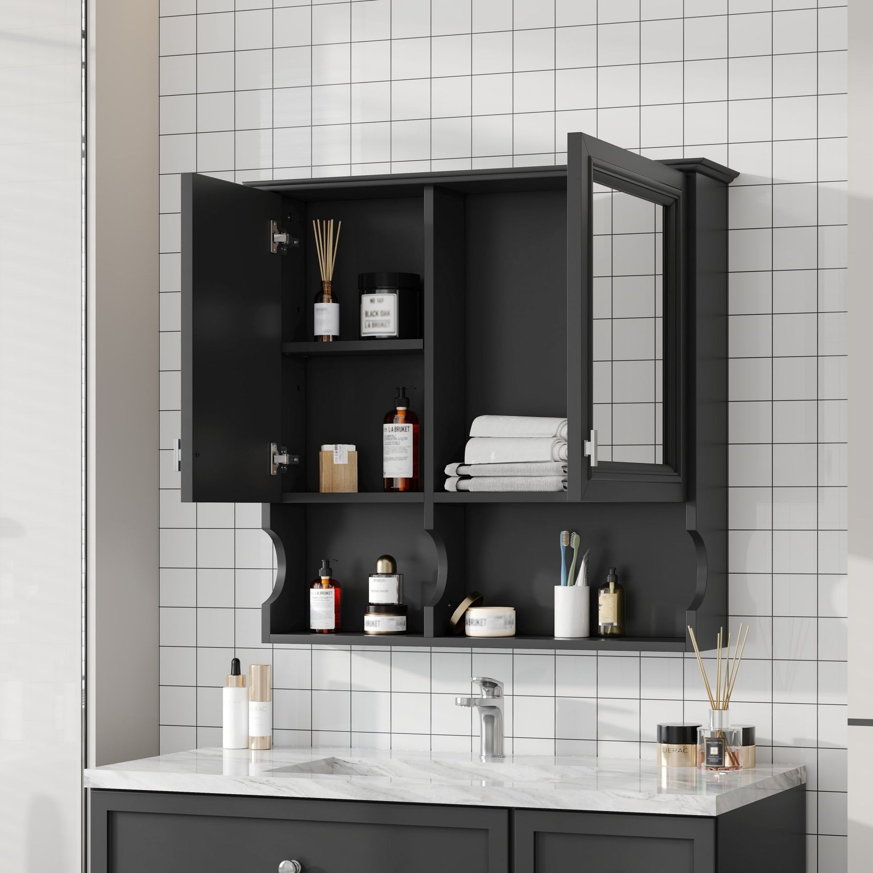 Wall Mounted Mirror Medicine Cabinet, Bathroom Storage With Doors And Open Shelves With Adjustable Shelf - Black