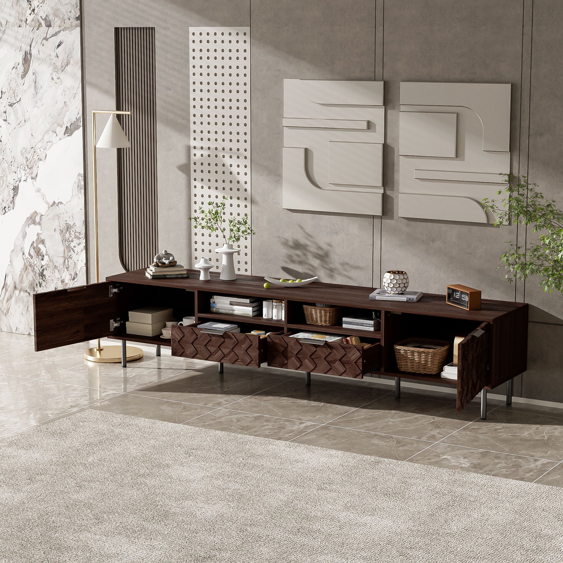 - Organized Entertainment Hub: Combines closed storage drawers, open shelves, and hidden compartments for efficient and stylish storage of media and accessories.